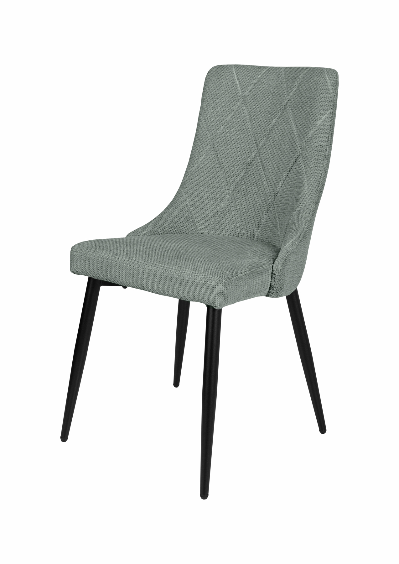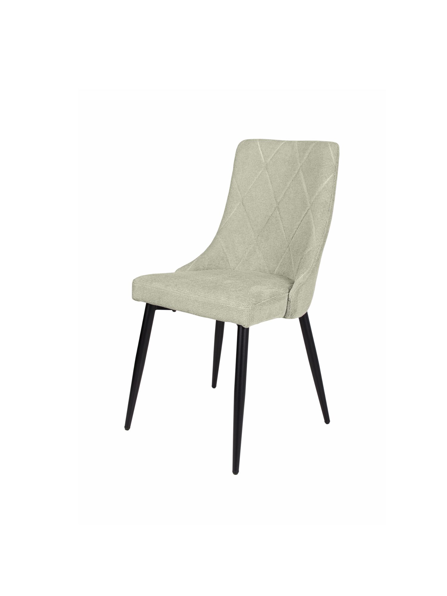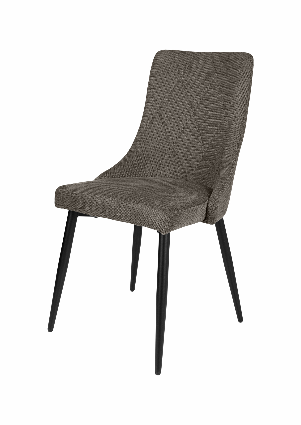Modern étkezőszék, enyhén ívelt háttámlával, puha tapintású szövet kárpittal, fekete porfestett fém lábakkal. Beige, barna és szürke színben érhető el.
