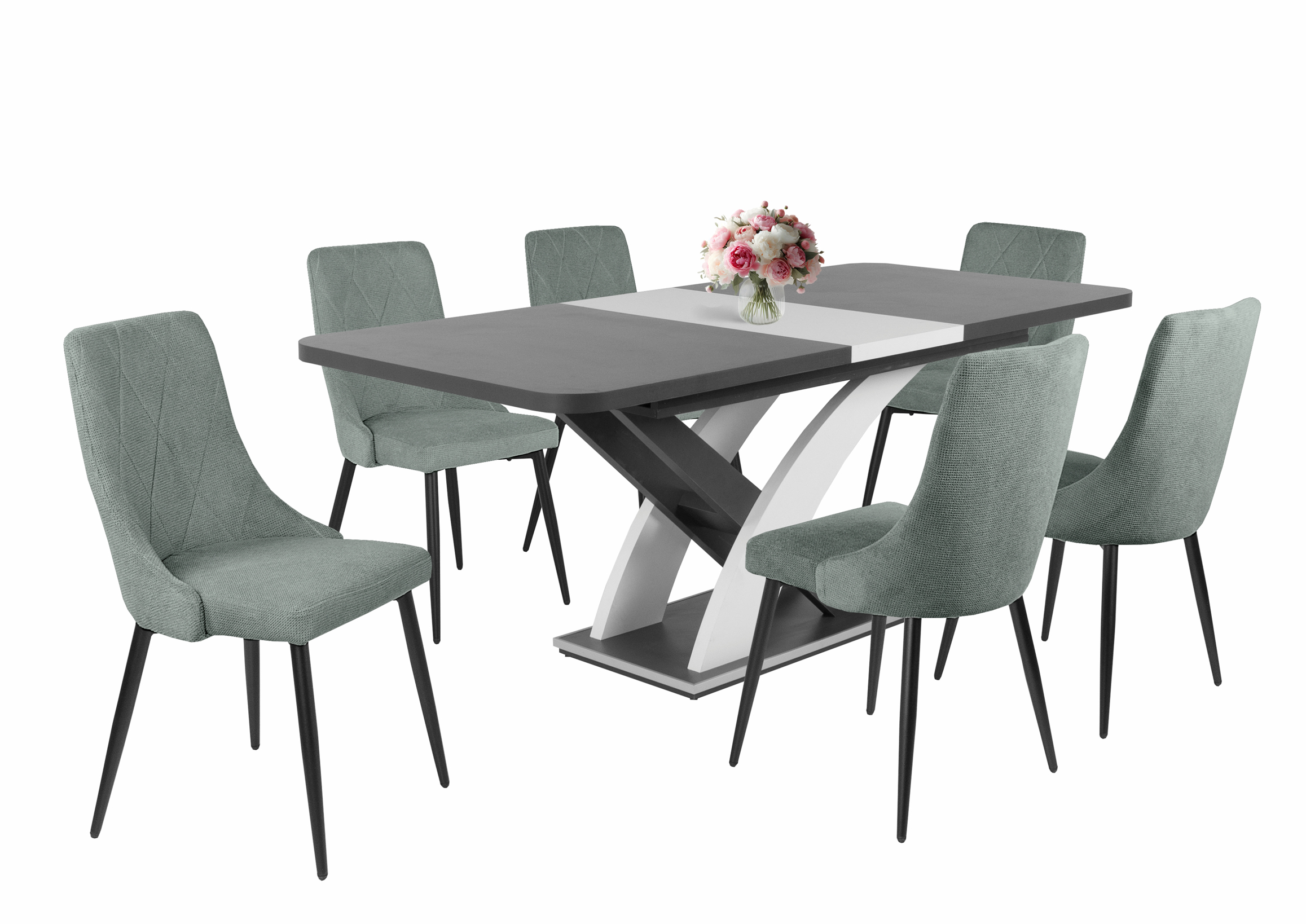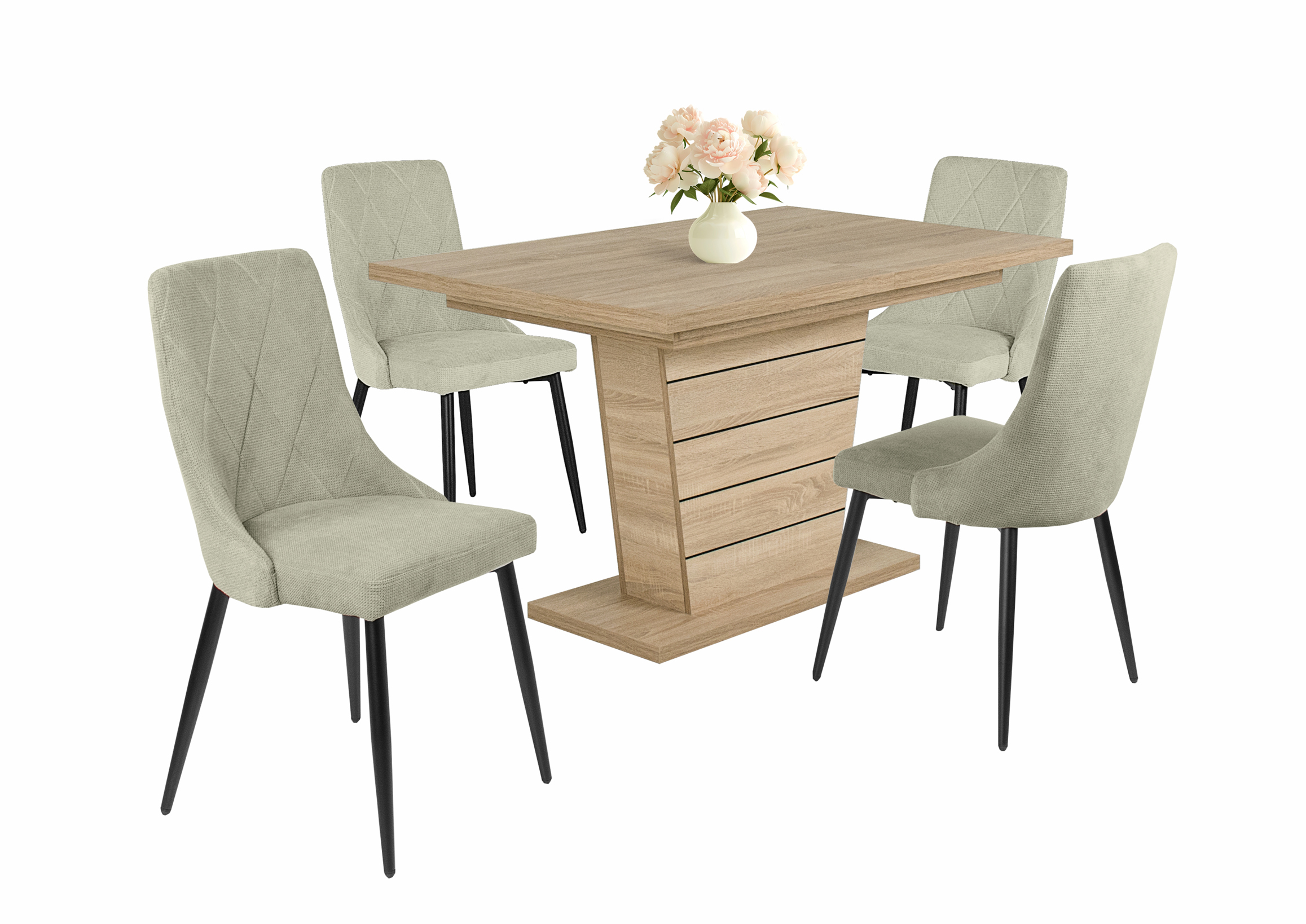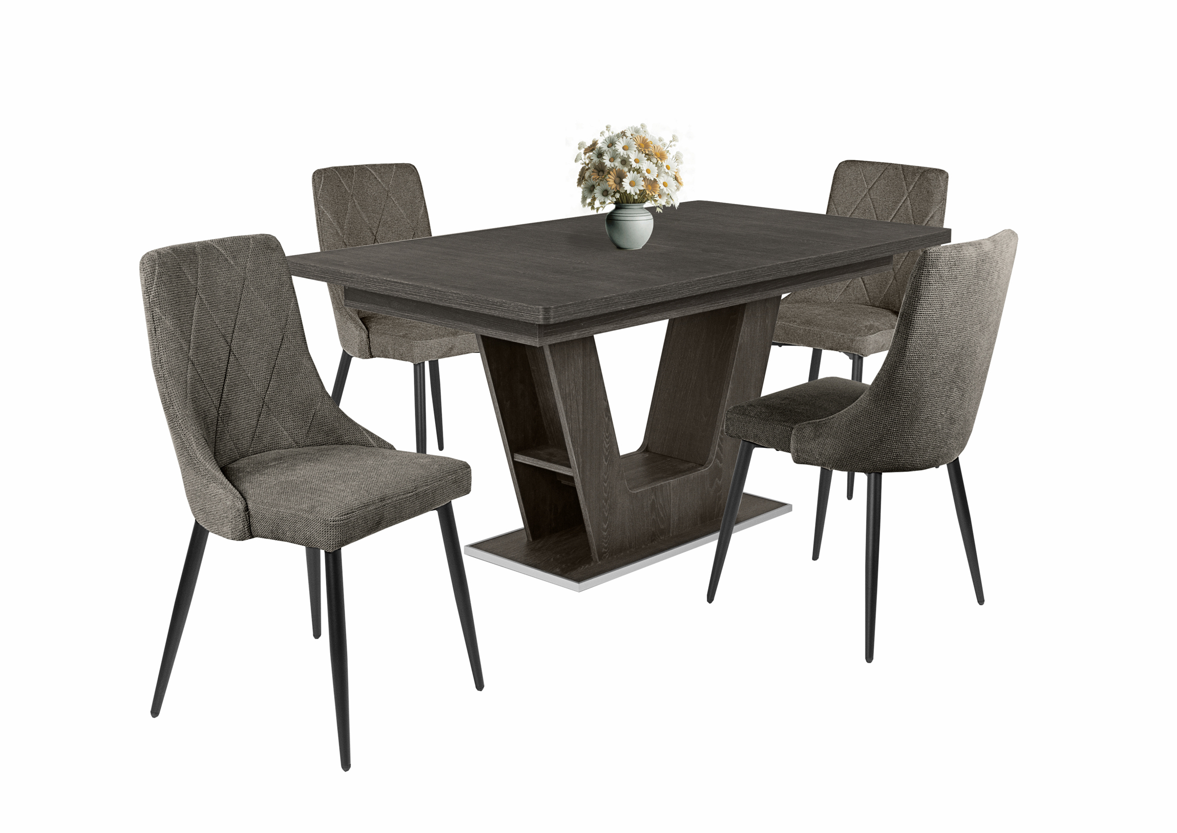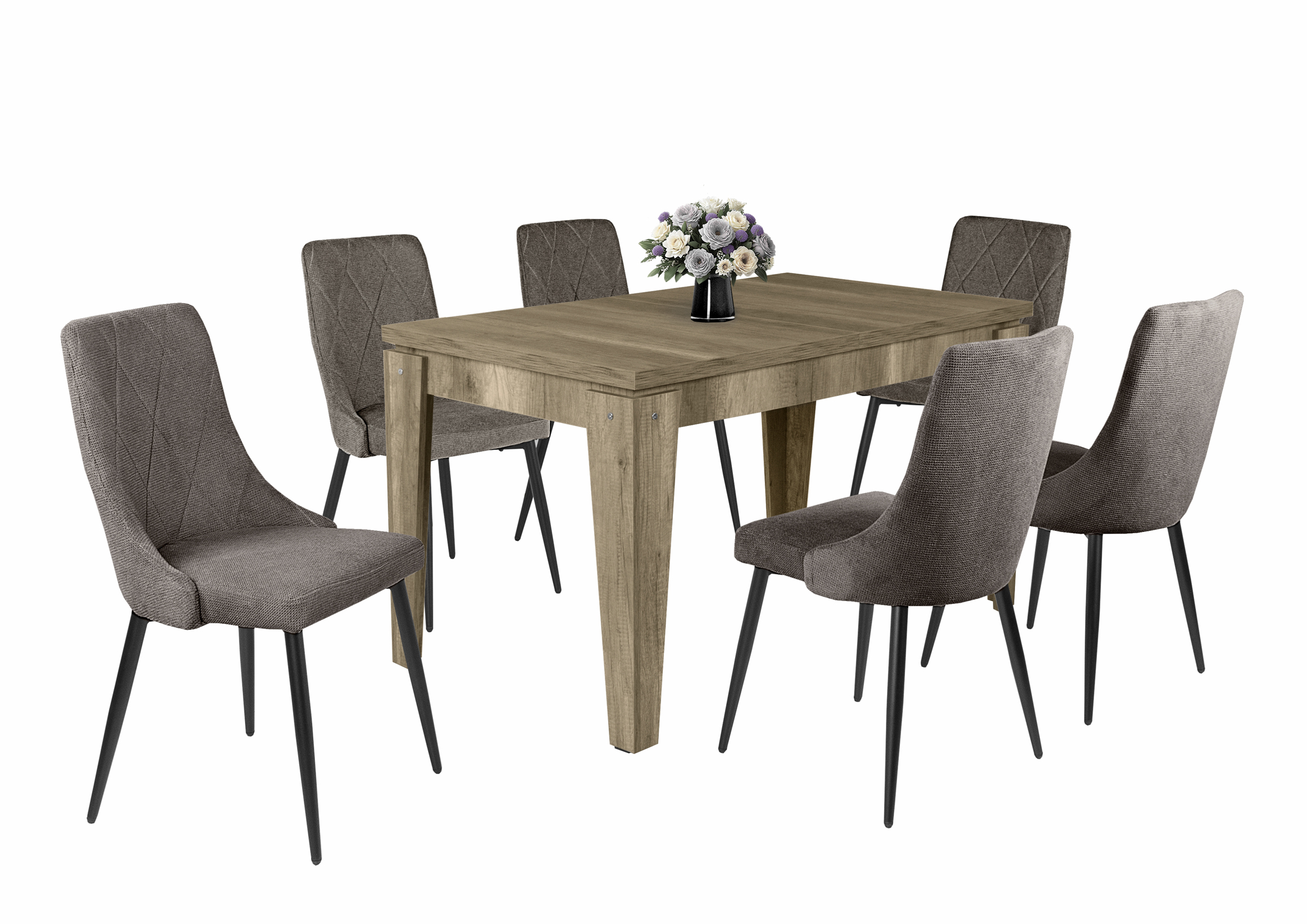 Modern étkezőszék, enyhén ívelt háttámlával, puha tapintású szövet kárpittal, fekete porfestett fém lábakkal. Beige, barna és szürke színben érhető el.