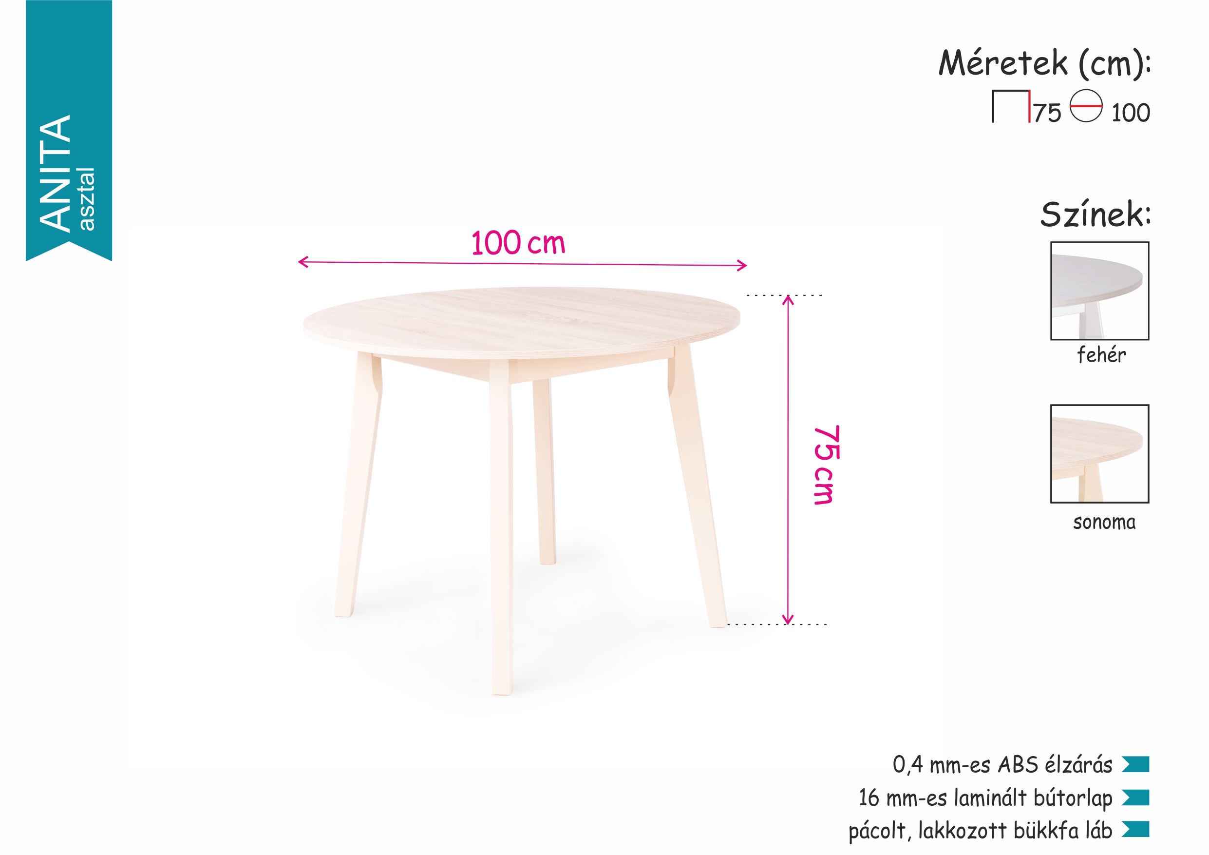 Az Anita asztal 100 cm-es átmérője miatt kifejezetten előnyös a kis alapterülettel rendelkező helyiségekben. Kör alakú asztallapjának köszönhetően kényelmesen elfér a 4 fős család is körülötte. Kettő elegáns színben választható asztalunk laminált bútorlapból készült, ABS élzárással. Letisztult formavilágának, elegáns sonoma és fehér színeinek köszönhetően megfelelő választás konyhákba, étkezőkbe, de akár éttermekbe, rendezvénytermekbe, esküvőkre is.