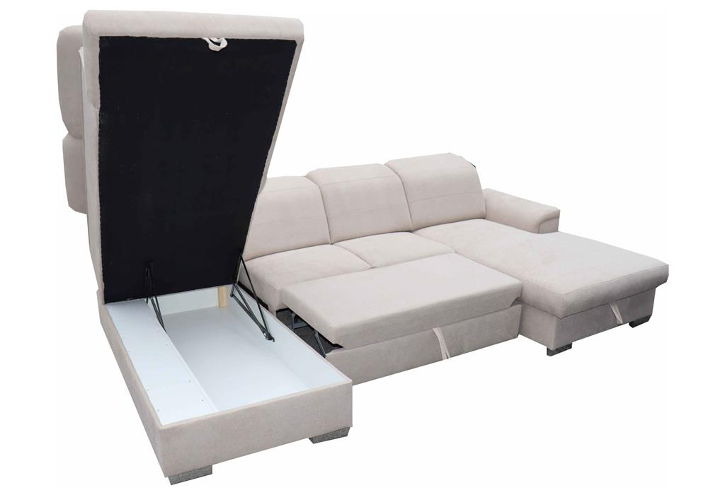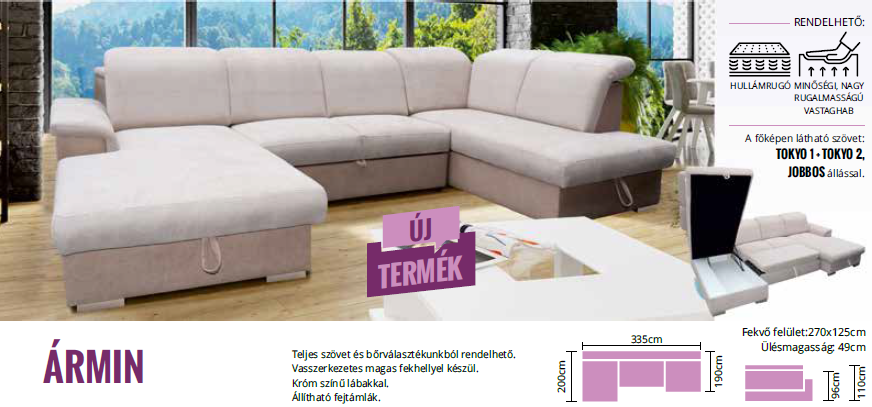 Hullámrugó + szivacsbetéttel, vasszerkezetes magas fekhellyel készül! 5 fokozatban állítható racsnis fejtámlákkal készül! Kettő darab ágyneműtartóval rendelkezik! Ülő magassága: 49 cm, mélysége: 57 cm, Támla magassága: 96 cm, Karfa magassága: 64 cm, szélessége: 32 cm, Fekvő mérete: 125*270 cm, Sarok teljes szélessége: 335 cm.