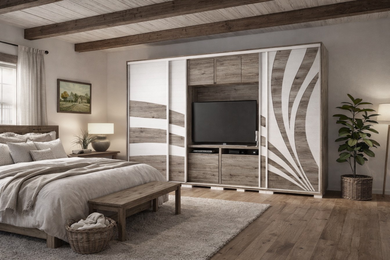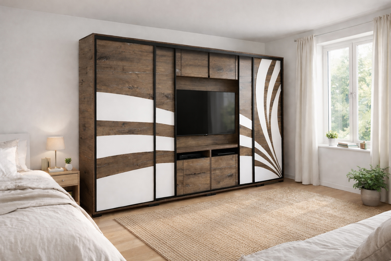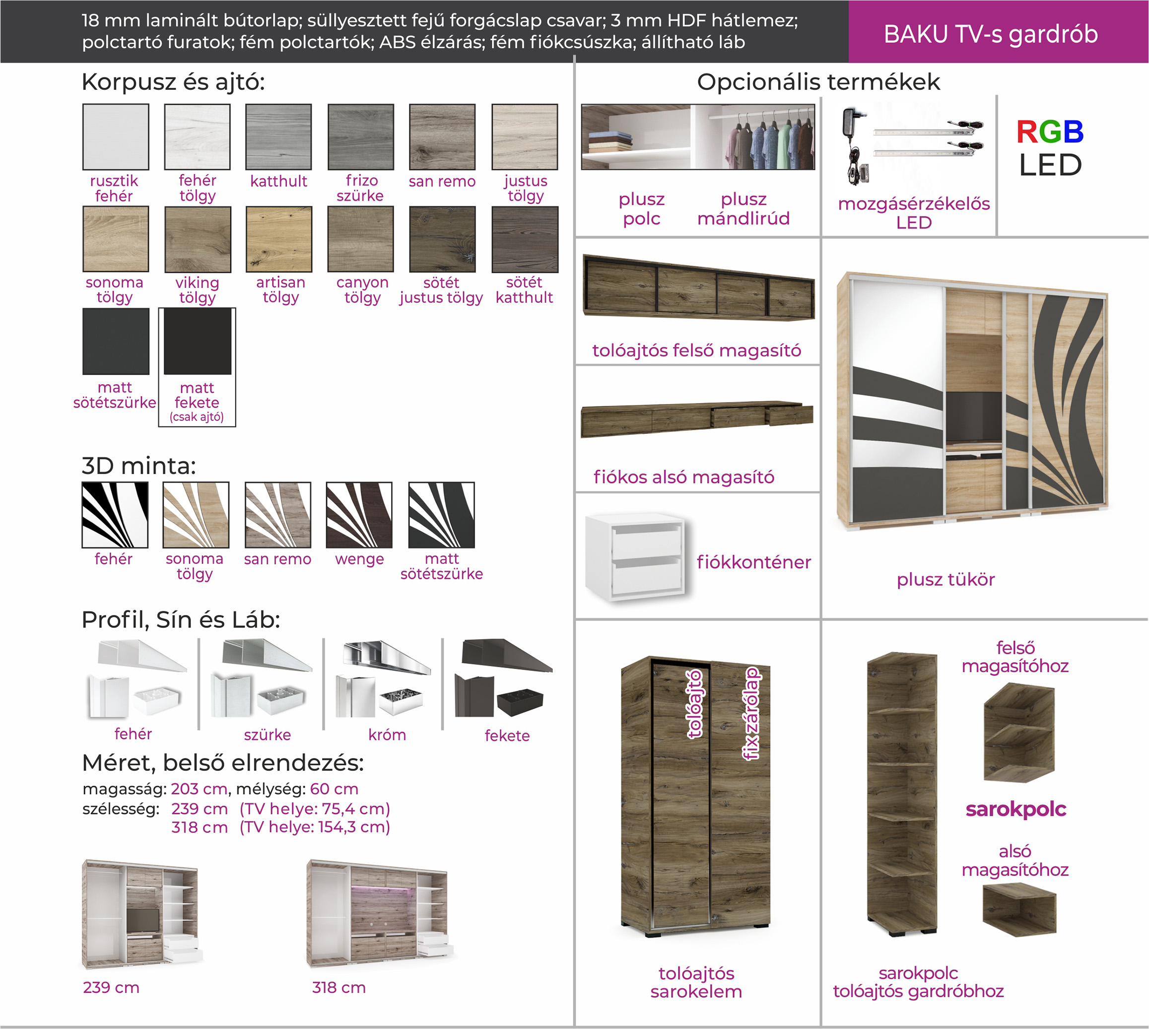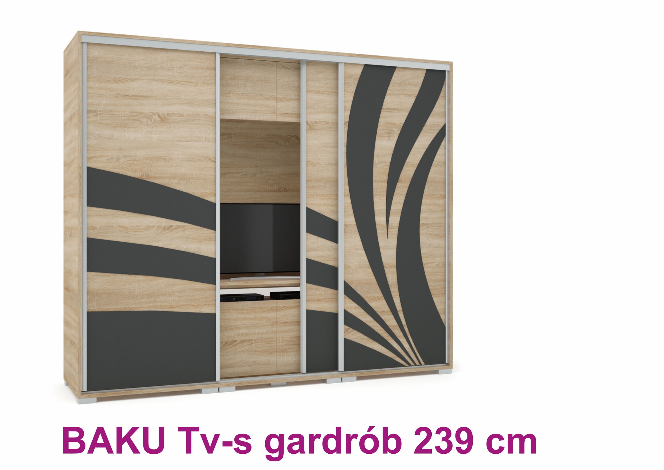 A Baku TV-s gardrób egyediségét az ajtón található, 5 színben elérhető 3D minta adja. A gardrób zárt állapotban egy elegáns tolóajtós gardróbnak tűnik, viszont a középső részen televízió számára kialakított hely található. Kiegészíthető még RGB Led világítással.