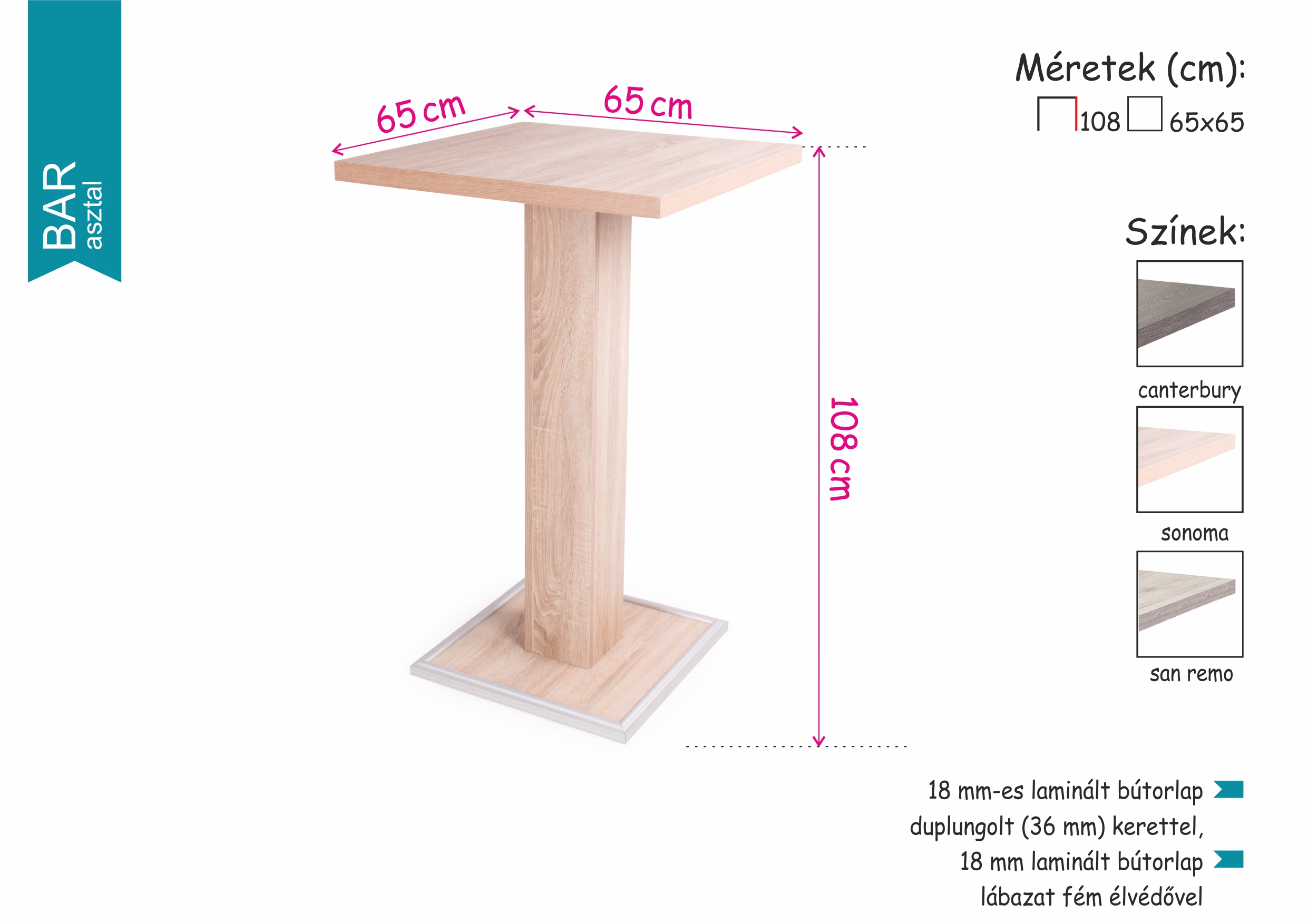 Minőségi, kis alapterületen elférő Bar asztalunk laminált bútorlapból készült, duplungolt kerettel, a lábazat fém élvédővel ellátott. Bárszékeinkkel kombinálva étkezőjét trendivé alakíthatja.