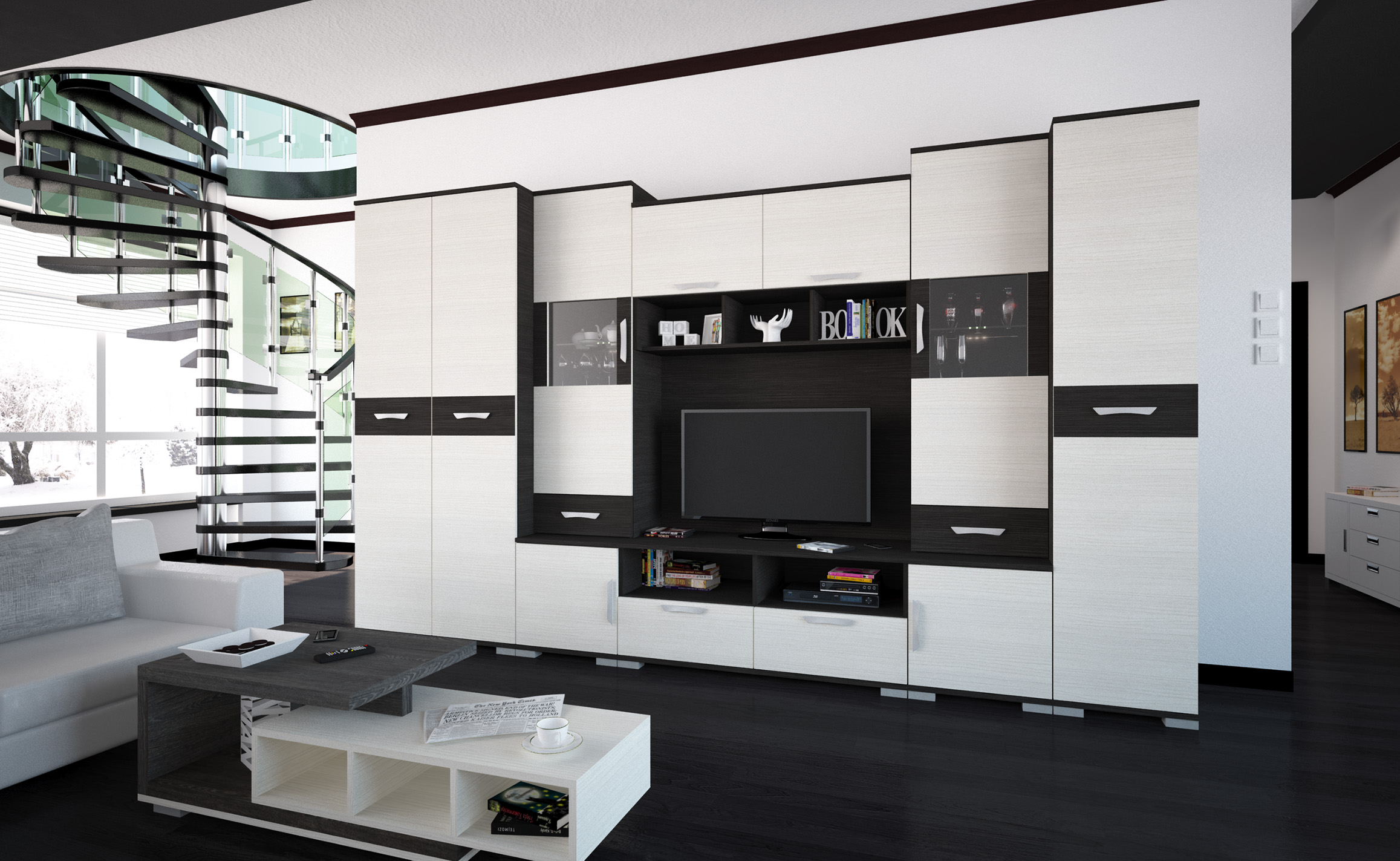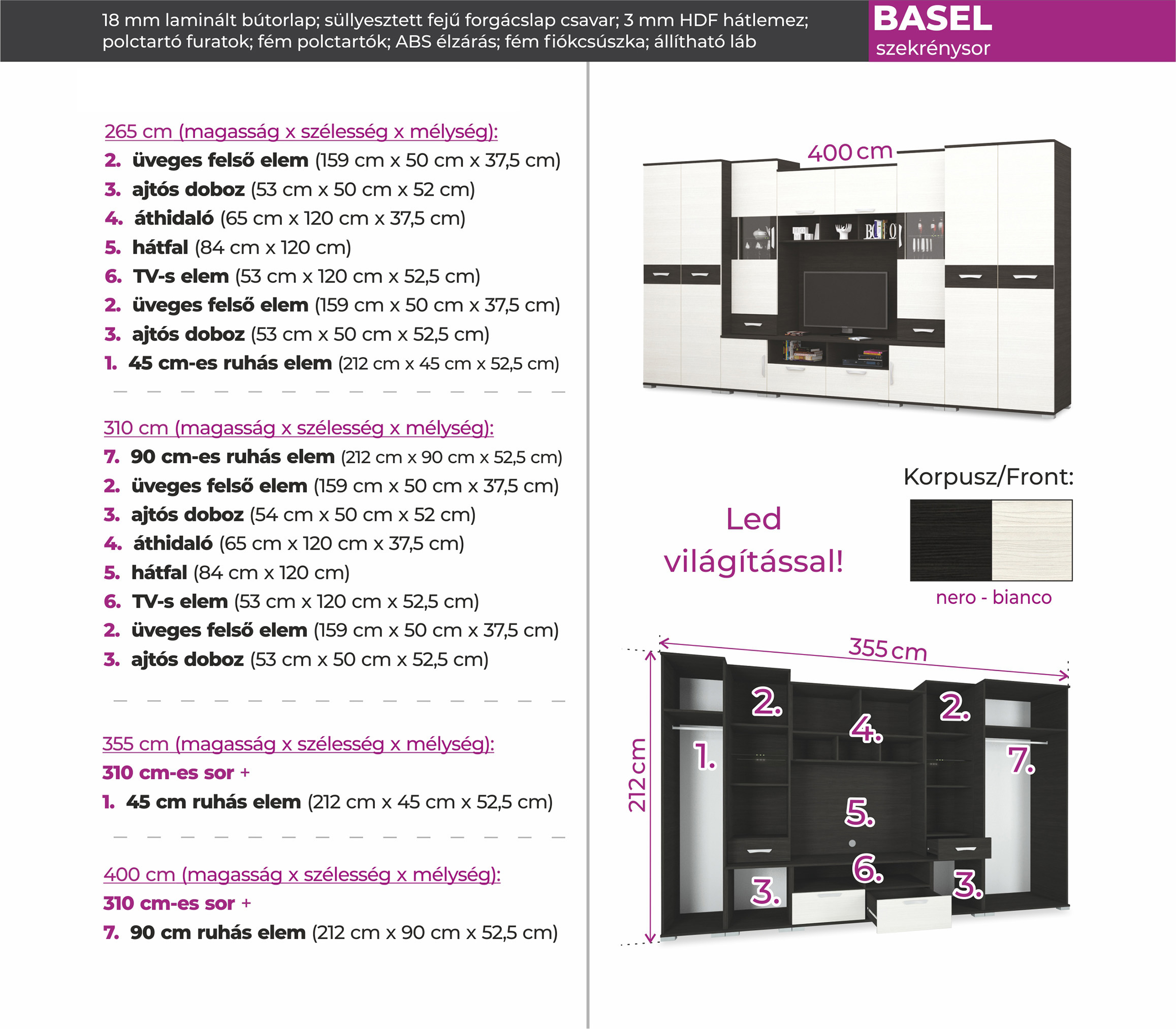 Basel nappali szekrénysorunk 265, 310, 355, 400 cm-es változatban kapható. Nero-bianco színben érhető el. Megjelenésében egy elegáns, modern szekrénysorról beszélhetünk. Igazi örömmel szolgálhat a szimmetria kedvelőinek. Az üveg polcok LED világítása egyedi hangulatot eredményez. Méreteinek köszönhetően nagyon jól pakolható, és kedvelt tárgyaink is kiemelt helyet kaphatnak.