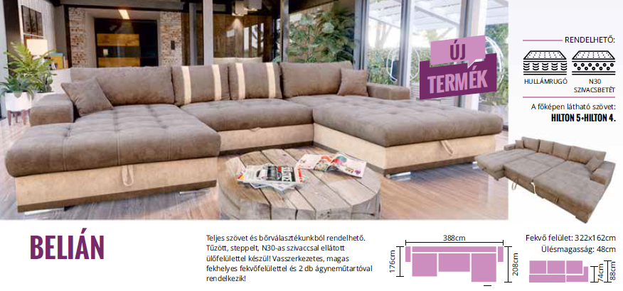 Tűzött, steppelt, N30-as szivaccsal ellátott ülőfelülettel készül! Vasszerkezetes, magas fekhelyes fekvőfelülettel és 2 db ágyneműtartóval rendelkezik! Teljes mérete: 388*208 cm. Ülő magassága: 48 cm, mélysége: 85 cm, párnával 65 cm. Támla magassága párna nélkül 74 cm, párnával: 88 cm. Karfa szélessége: 30 cm, magassága: 61 cm.