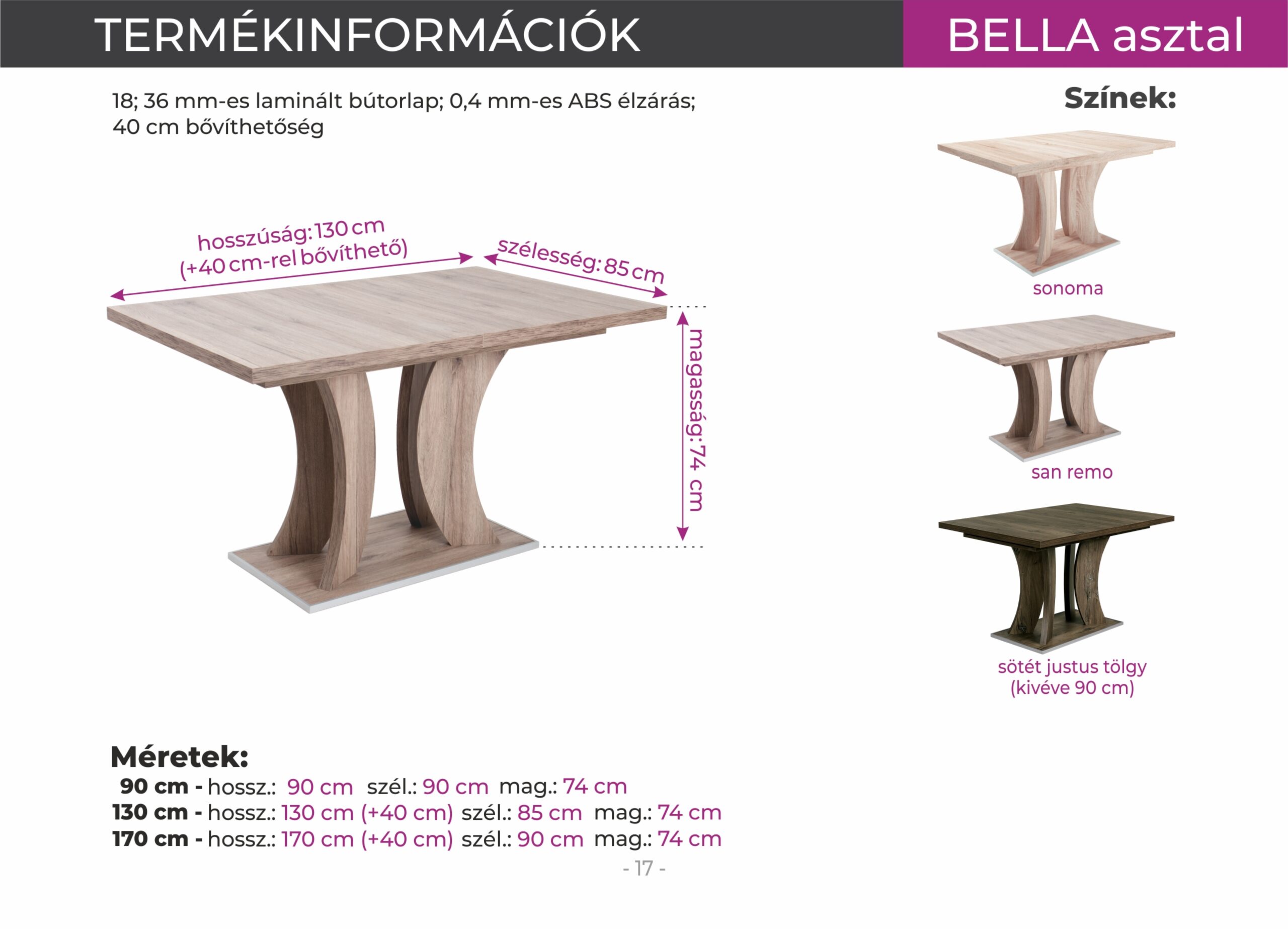 Ha nem csak egy asztalt szeretne a konyhájába, de egy igazán stílusos bútordarabot is egyben, akkor a Bella asztal lehet a tökéletes választás. A letisztult formavilágú asztallapot nagyszerűen egészítik ki az ívelt lábak. 3 méretben kapható (90×90 cm; 130×85 cm; 170×90 cm), sonoma és san remo színekben, így biztosan Ön is találhat az étkezőjébe megfelelőt.