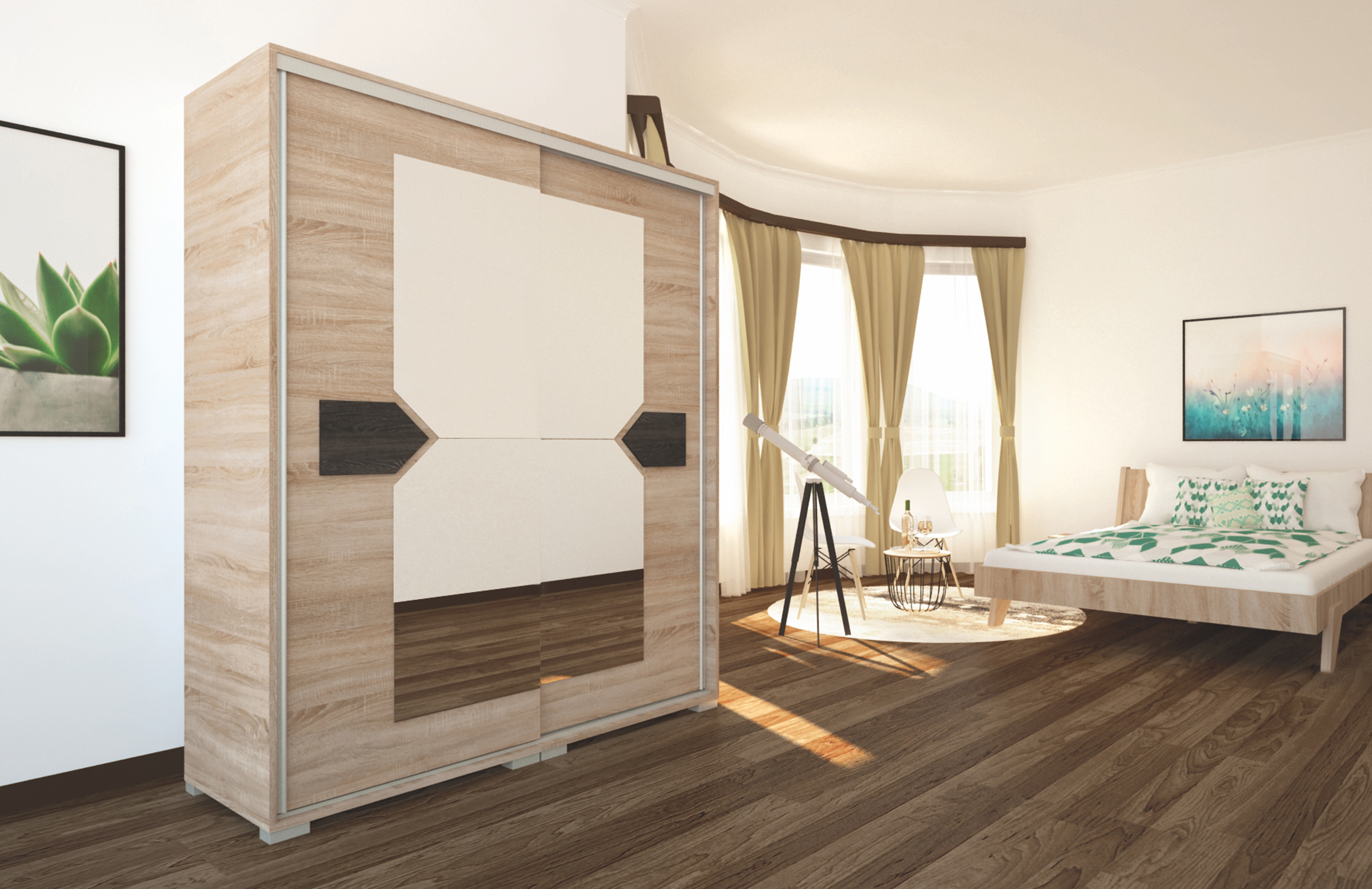 A Bravo gardrób egyediségét az ajtón látható dísz és a hozzá igazodó tükör együttesen alkotja. Bútorlapos kivitelben a 16 korpusz és ajtó szín szabadon variálható a san remo és canterbury betét színekkel. A 160 cm-es méret a legtöbb hálószobába ideális. Opcionálisan választható termékek: – sarokpolc – tolóajtós sarokelem – fiókos alsó magasító – tolóajtós felső magasító.