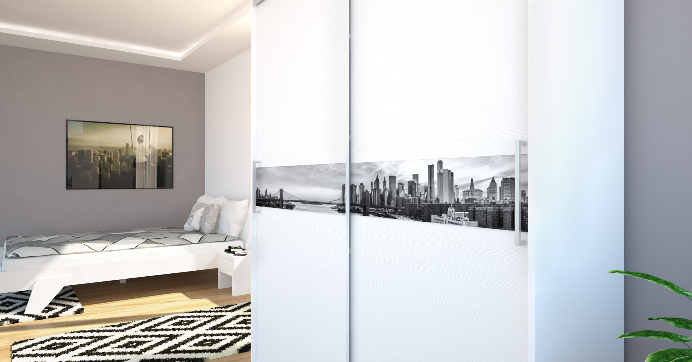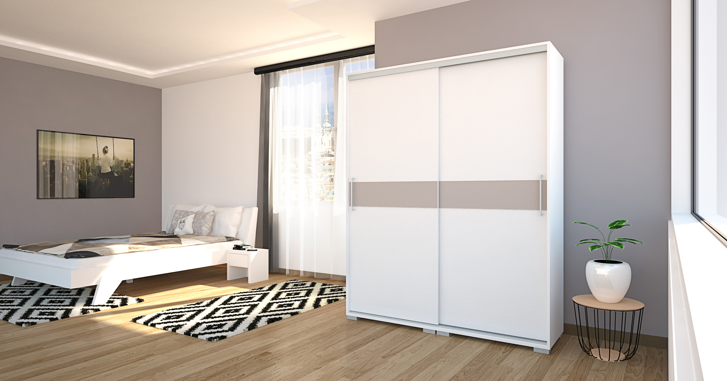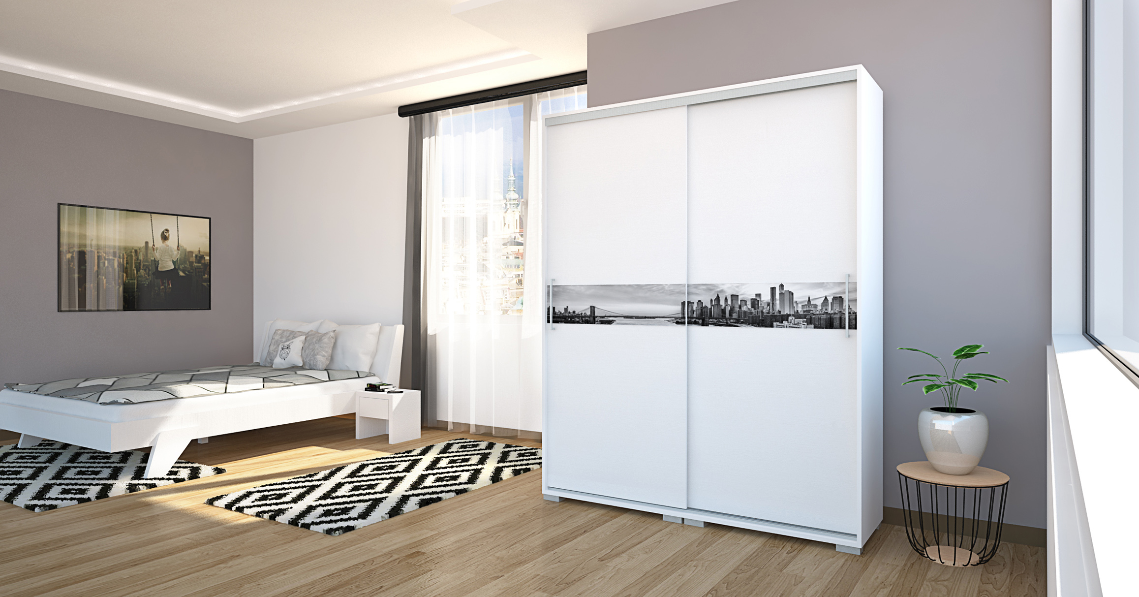 A City gardrób egy kicsit eltér a tőlünk megszokott gardrób méretektől. Fehér korpusza rusztik fehér ajtóval lett kiegészítve. A középen elhelyezkedő üveg dekor lehet városkép, vagy akár 6 féle betétszín. Két oldalt az üveglapon átívelő fogó található, ami a könnyebb használatot hivatott segíteni. Betét nélkül is kérhető. Letisztult, egyszerű formavilágával könnyen beilleszkedik a legtöbb hálószobába. 160 cm-es variációban kapható, polcos belső elrendezéssel. Mindössze 48 centiméter mély, ennek köszönhetően helytakarékos, belsejében mégis kényelmesen elférnek ruháink.
