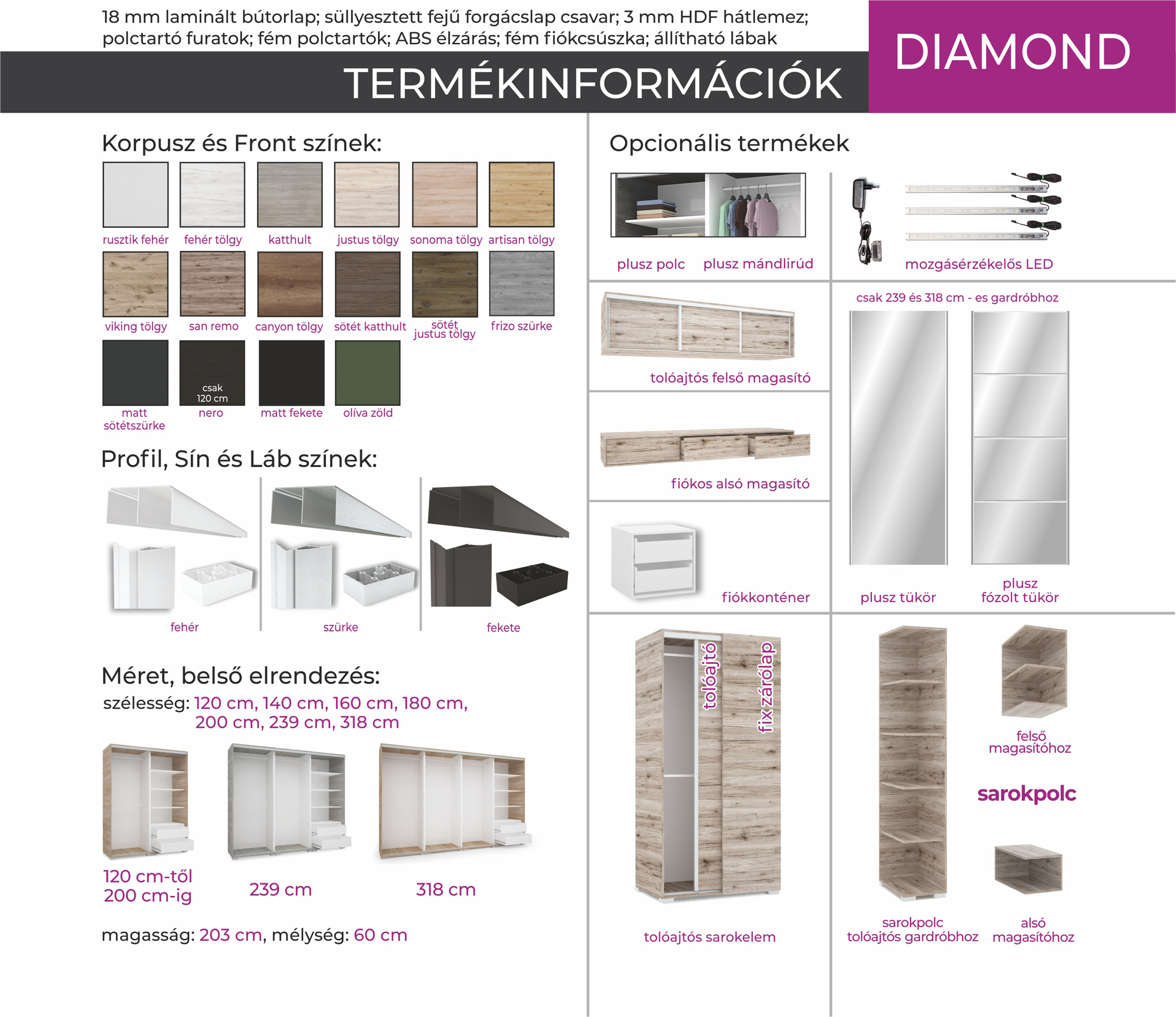 Diamond gardróbunk igazi „ékszer” lehet a hálószobájában. 7 méretben és 18 színben kapható. Külsejét tekintve egy nagyon fiatalos, nőies, elegáns gardrób. Az ajtón található szögletesen vágott tükrök jellegzetes karakteres megjelenést adnak a gardróbnak. Opcionálisan választható termékek: – sarokpolc – tolóajtós sarokelem – fózolt tükör – tükör – fiókos alsó magasító – tolóajtós felső magasító.