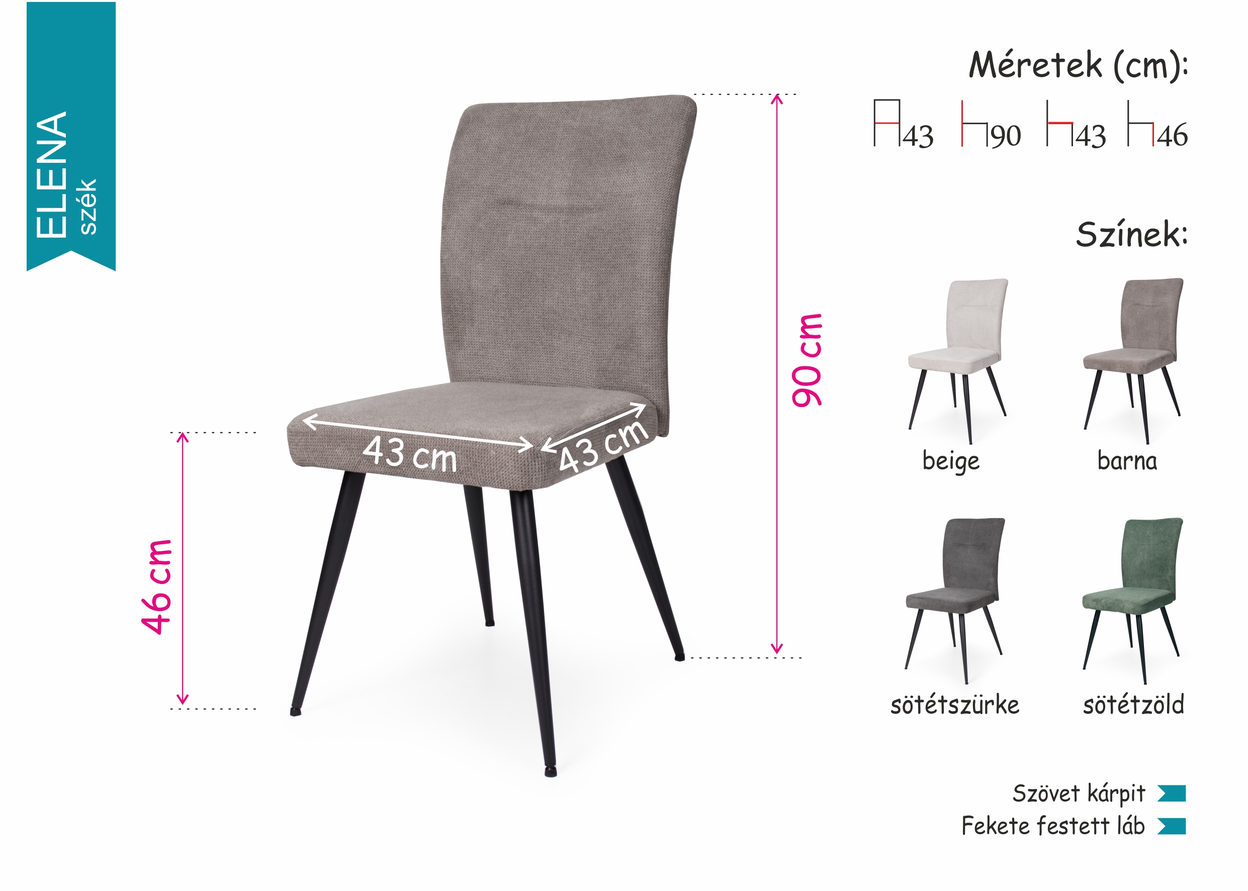 Az Elena szék szövet kárpittal, és fekete festett lábakkal kitűnő kiegészítője a modern otthonoknak. Négy színben érhető el: beige, barna, sötétszürke és sötétzöld.