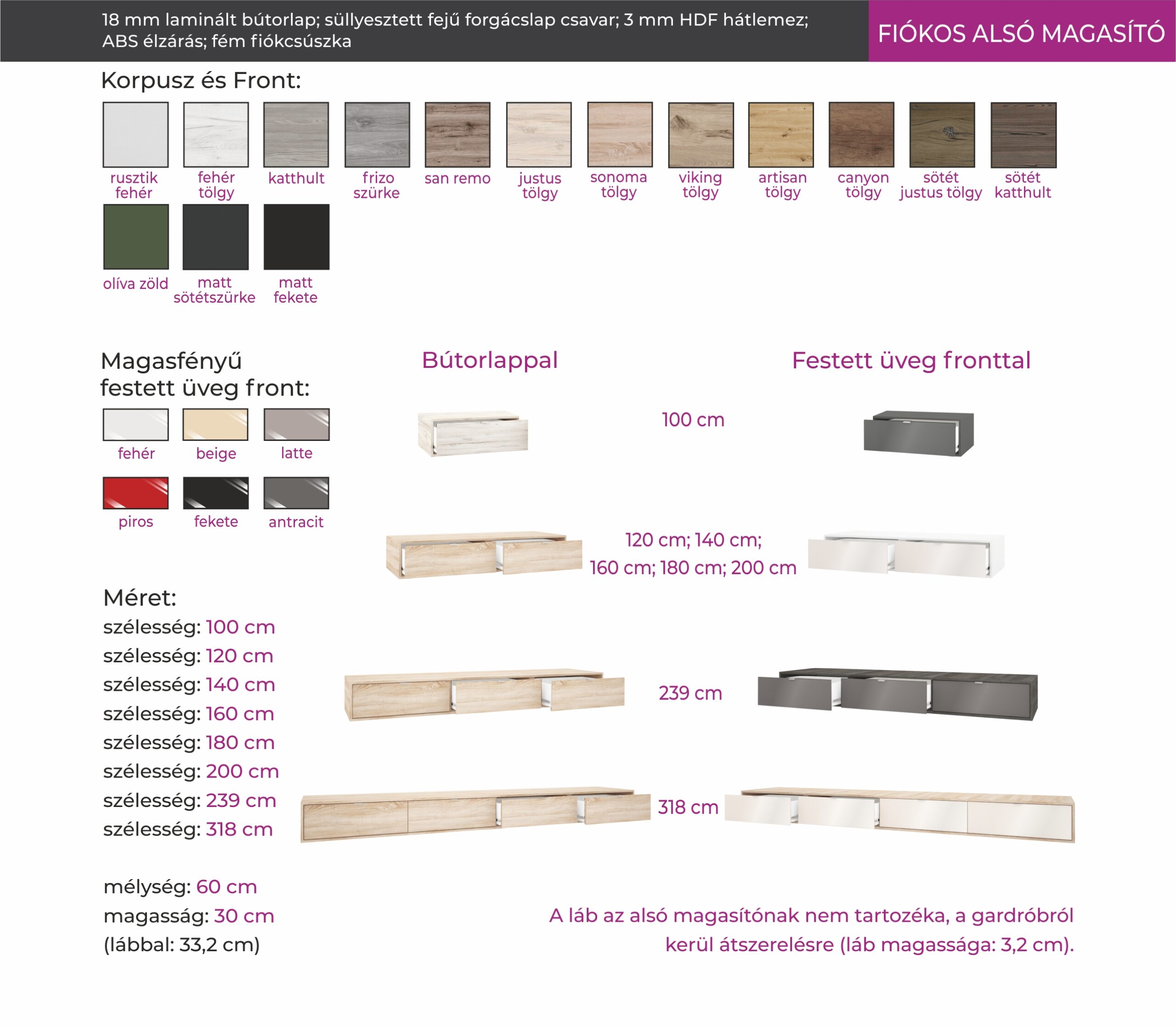 Opcionálisan rendelhető: alsó magasító, 100-318 cm-es méretű gardróbokhoz illetve a tolóajtós sarokelemhez. Opcionálisan rendelhető: magasfényű alsó magasító, 100-318 cm-es méretű gardróbokhoz illetve a tolóajtós sarokelemhez. A fiókos magasítónak nem tartozéka a láb. Ha önálló termékként szeretné megvásárolni, külön meg kell rendelni hozzá a lábakat. Ha gardróbbal együtt vásárolja meg, a gardrób lábát át lehet szerelni a magasítóra.