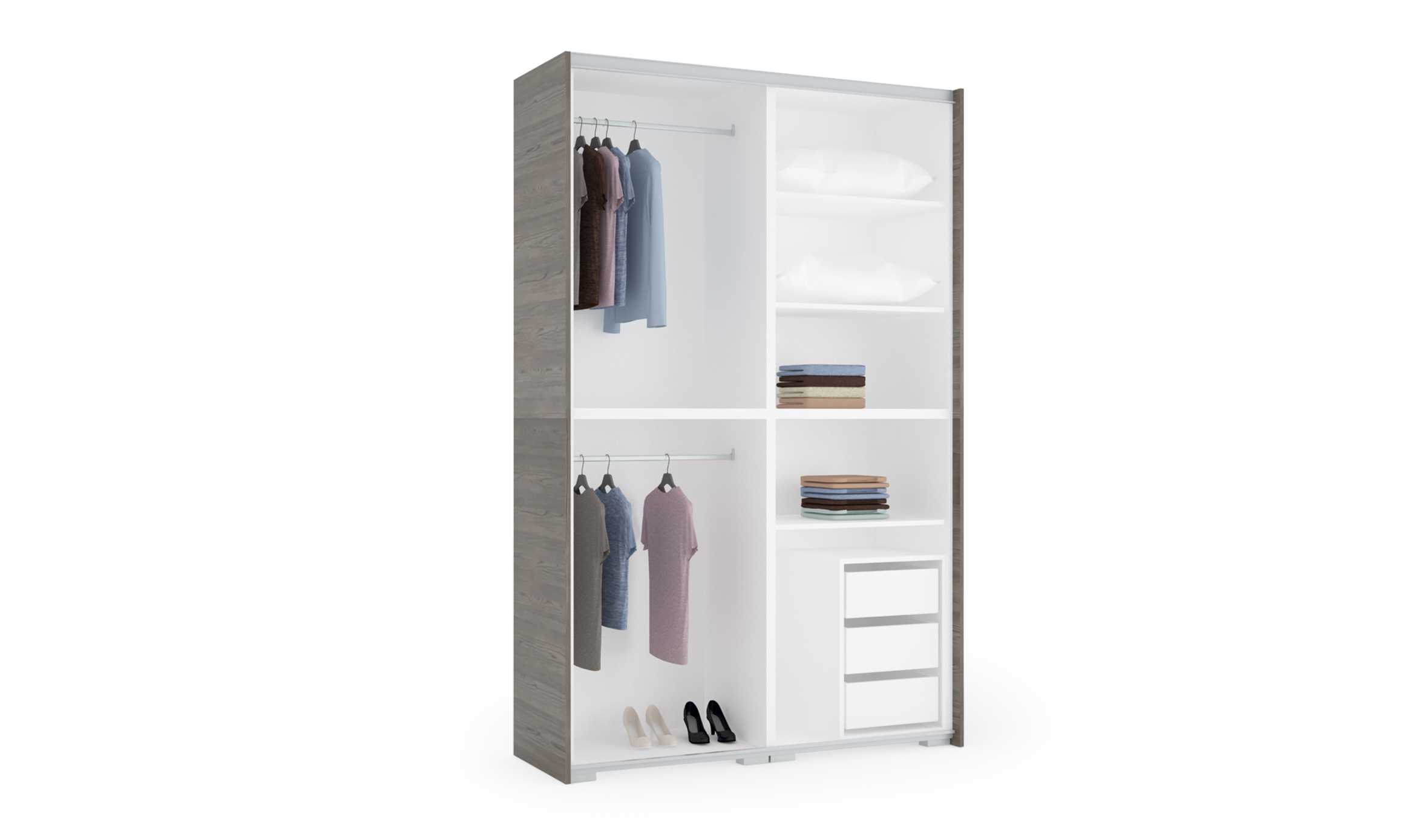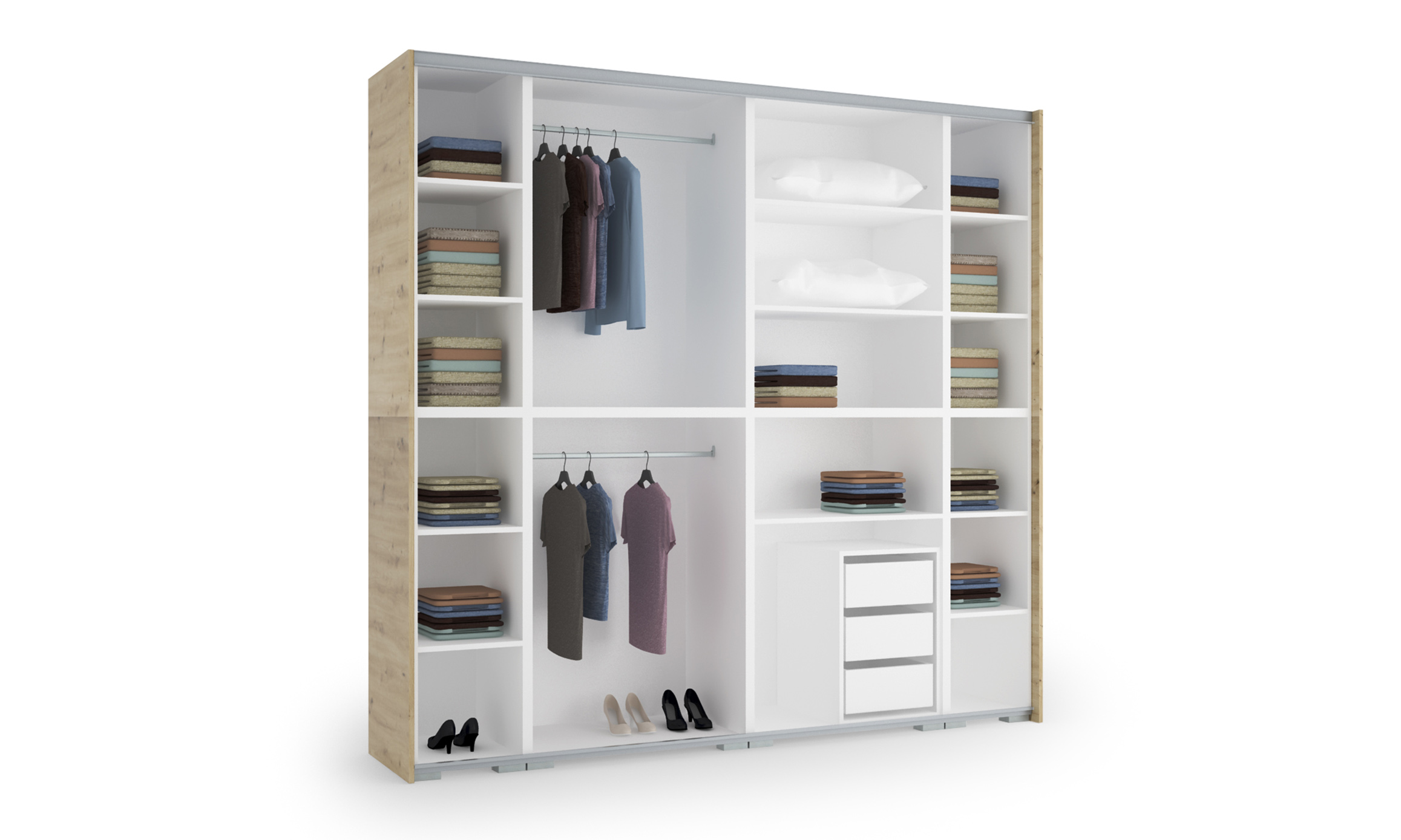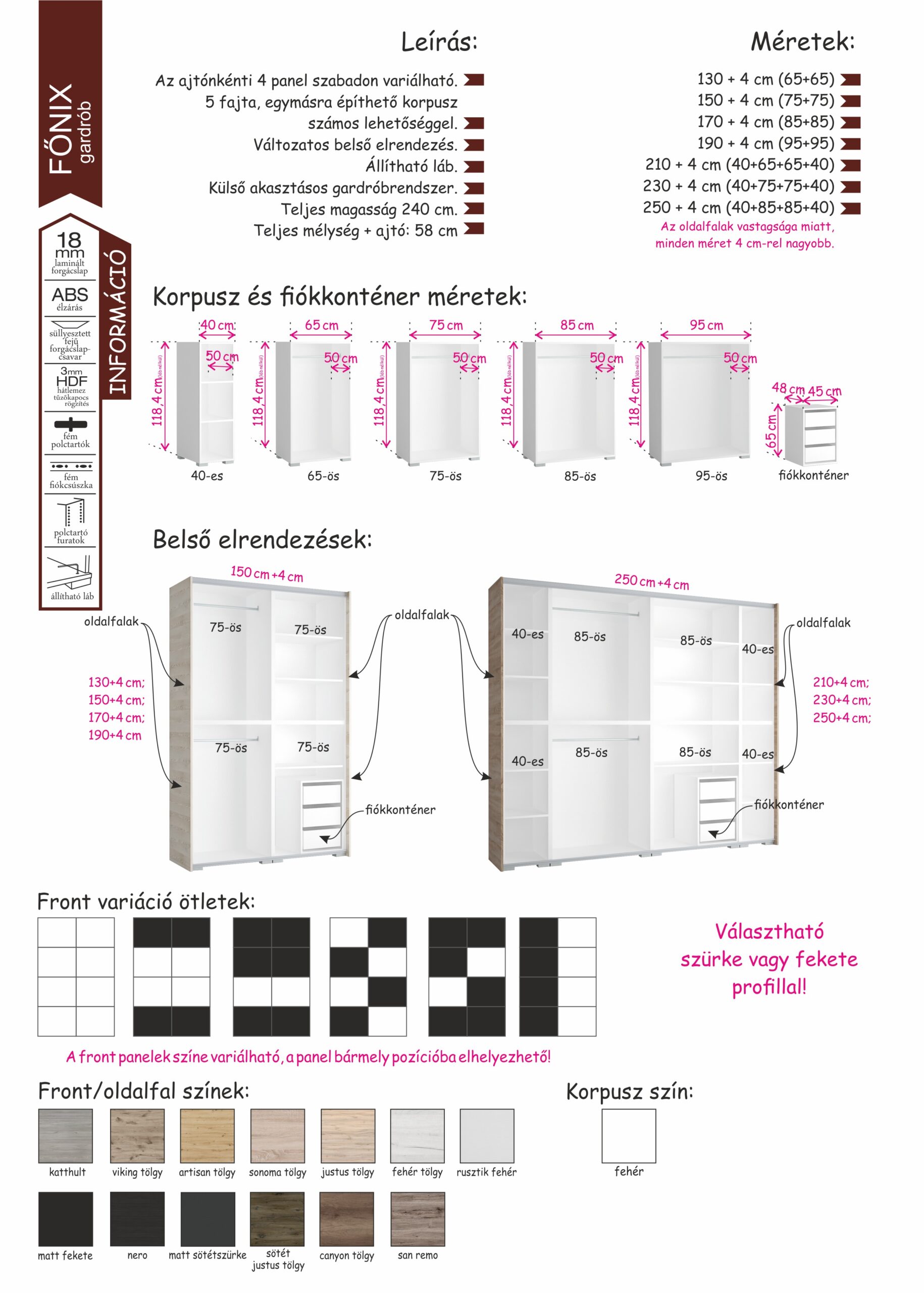 Miért a Főnix az egyik legjobb gardrób? Elegáns külső, praktikus belső elrendezés! A 2 ajtó 8 panelből áll. Mind a panelek, mind az oldalfal 13-féle színben kérhető, így a legkülönfélébb színvariációk állíthatóak össze. Gardróbunk rendelhető egy színben, soronként vagy akár sakktábla minta szerint változó színű ajtóval. Az ajtó kérhető tükörrel is! Még a profil színét is kiválaszthatjuk, lehetőség van szürke vagy fekete profillal kérni a terméket. A 240 cm-es magasságnak és a 7-féle szélességnek köszönhetően remek választás a kisebb szobával rendelkezőknek és a nagy tárolóhelyre vágyók számára egyaránt. Választható szürke vagy fekete fogó, illetve már fekete lábbal is rendelhető.