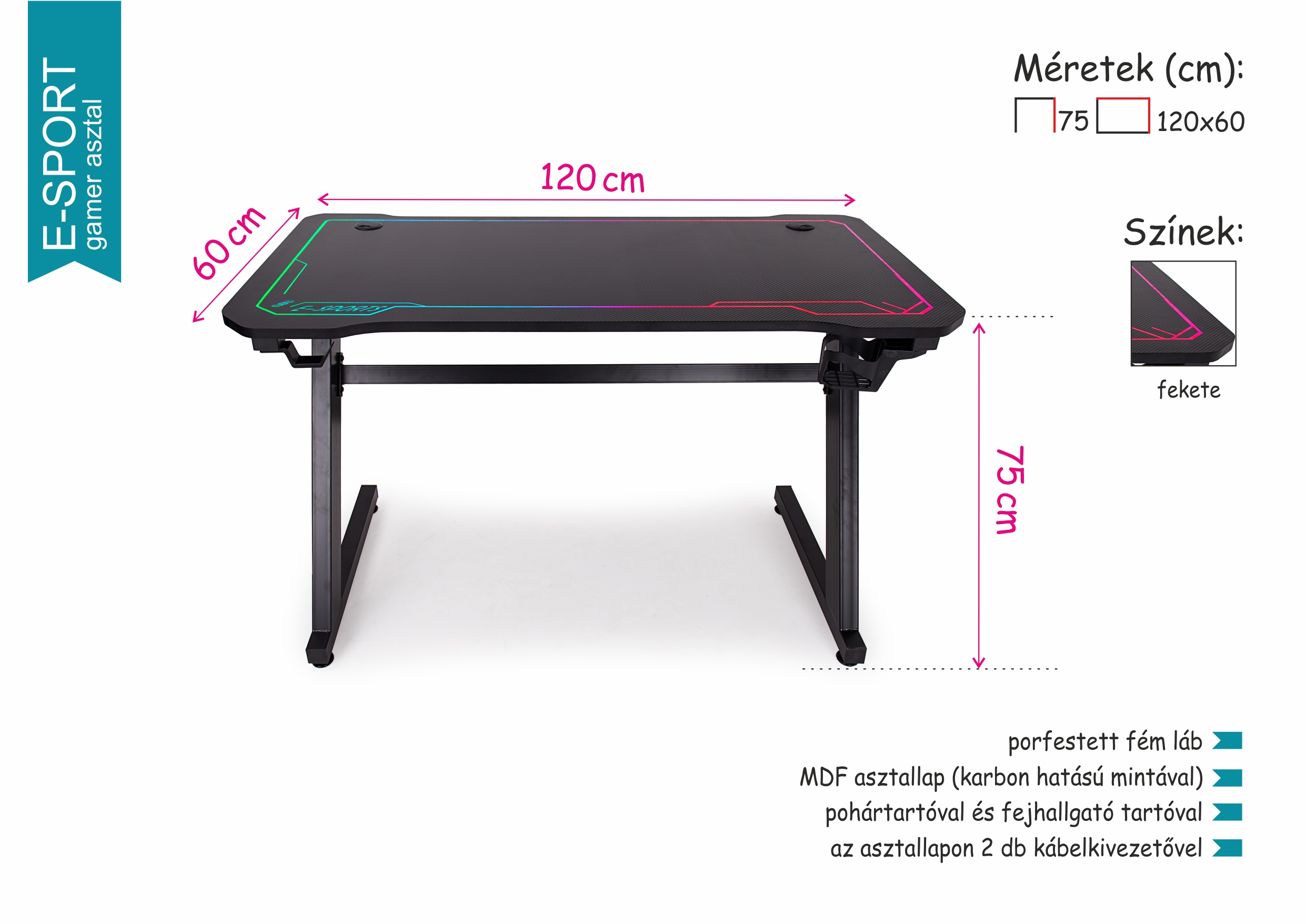 Az E-Sport gamer asztalunk kihajtható pohár- illetve fejhallgató tartóval igazi kényelmet biztosít a játékosok számára. A porfestett fém láb és az asztallapon található karbon hatású minta trendi megjelenést kölcsönöz az asztalnak.