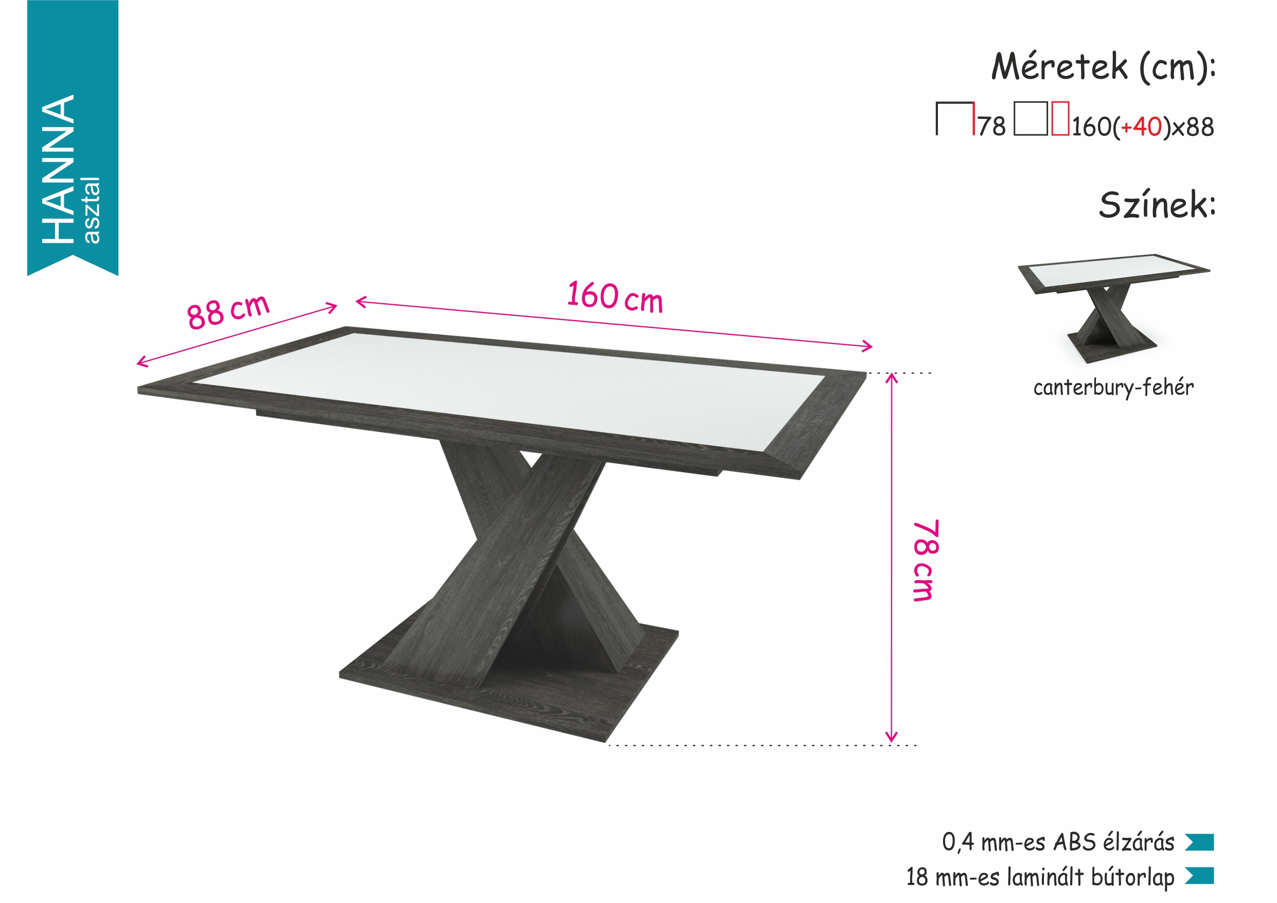 A Hanna asztalt egyedi kialakítású lába, elegáns, fehér betétes asztallapja az étkező meghatározó elemévé teszi. Laminált bútorlapból, ABS élzárással készül, canterbury színben. 160×88 cm-es méretének köszönhetően kényelmes elhelyezkedést biztosít az étkezések során, de szükség esetén vendéglapja segítségével további 40 cm-rel bővíthető.
