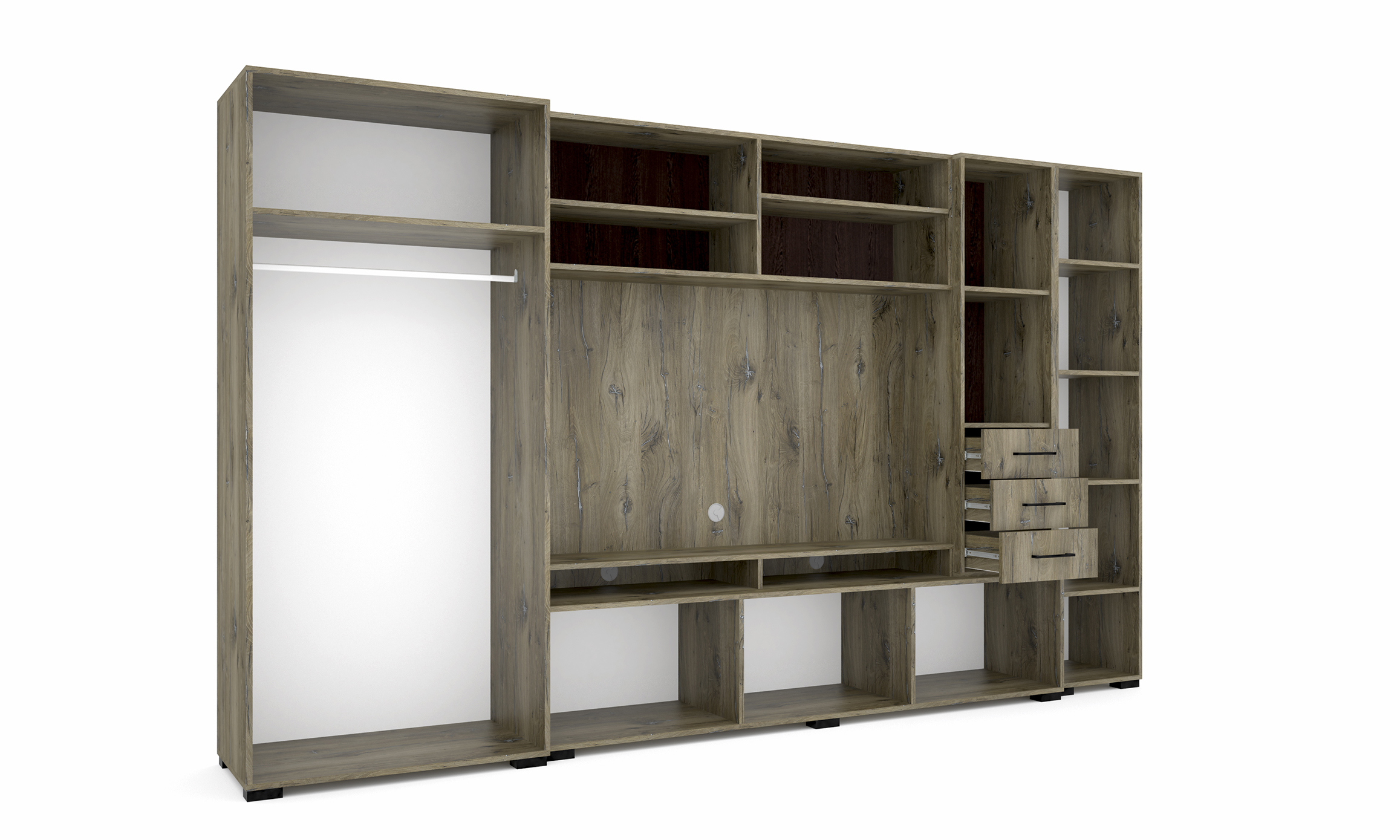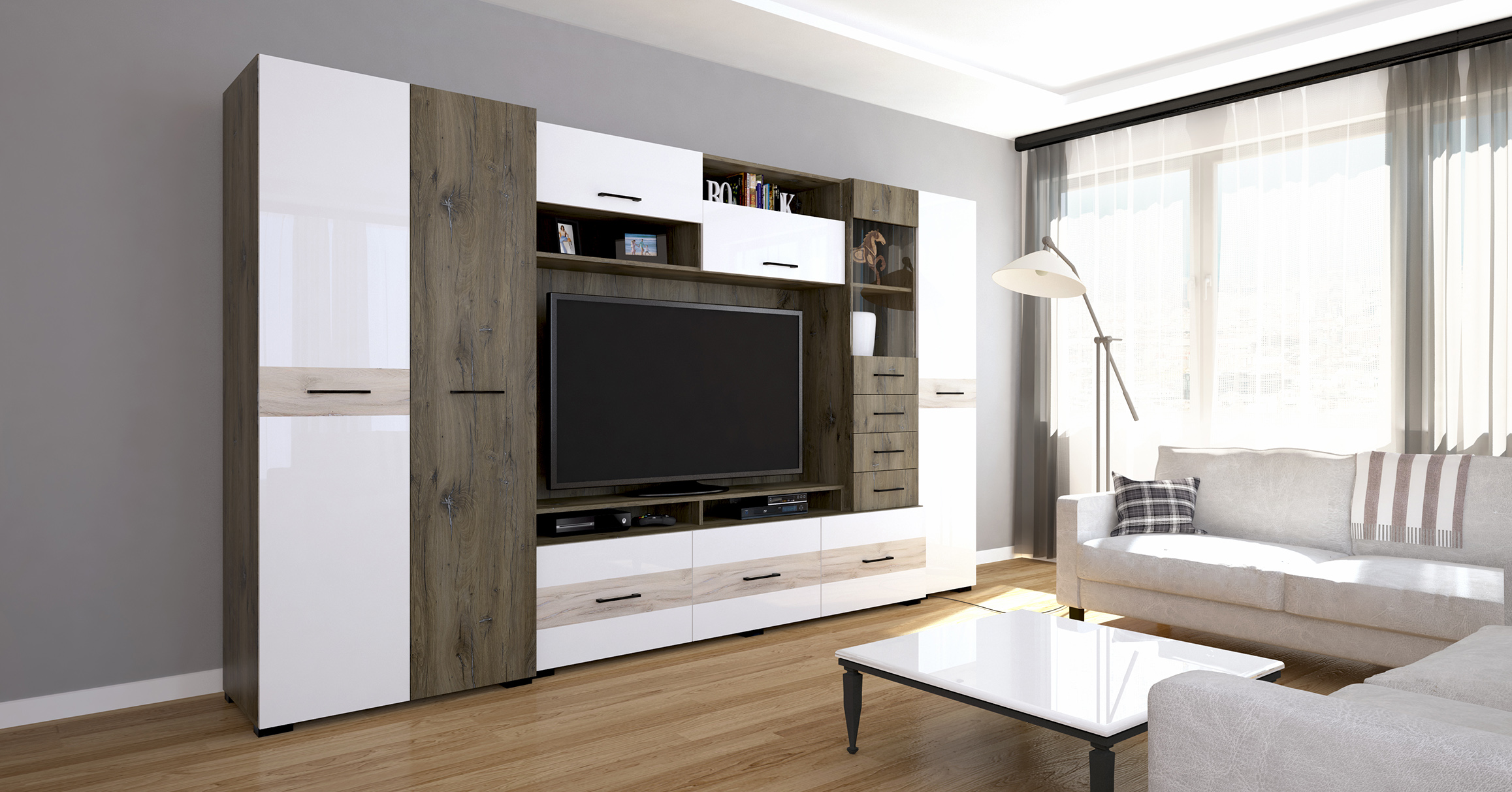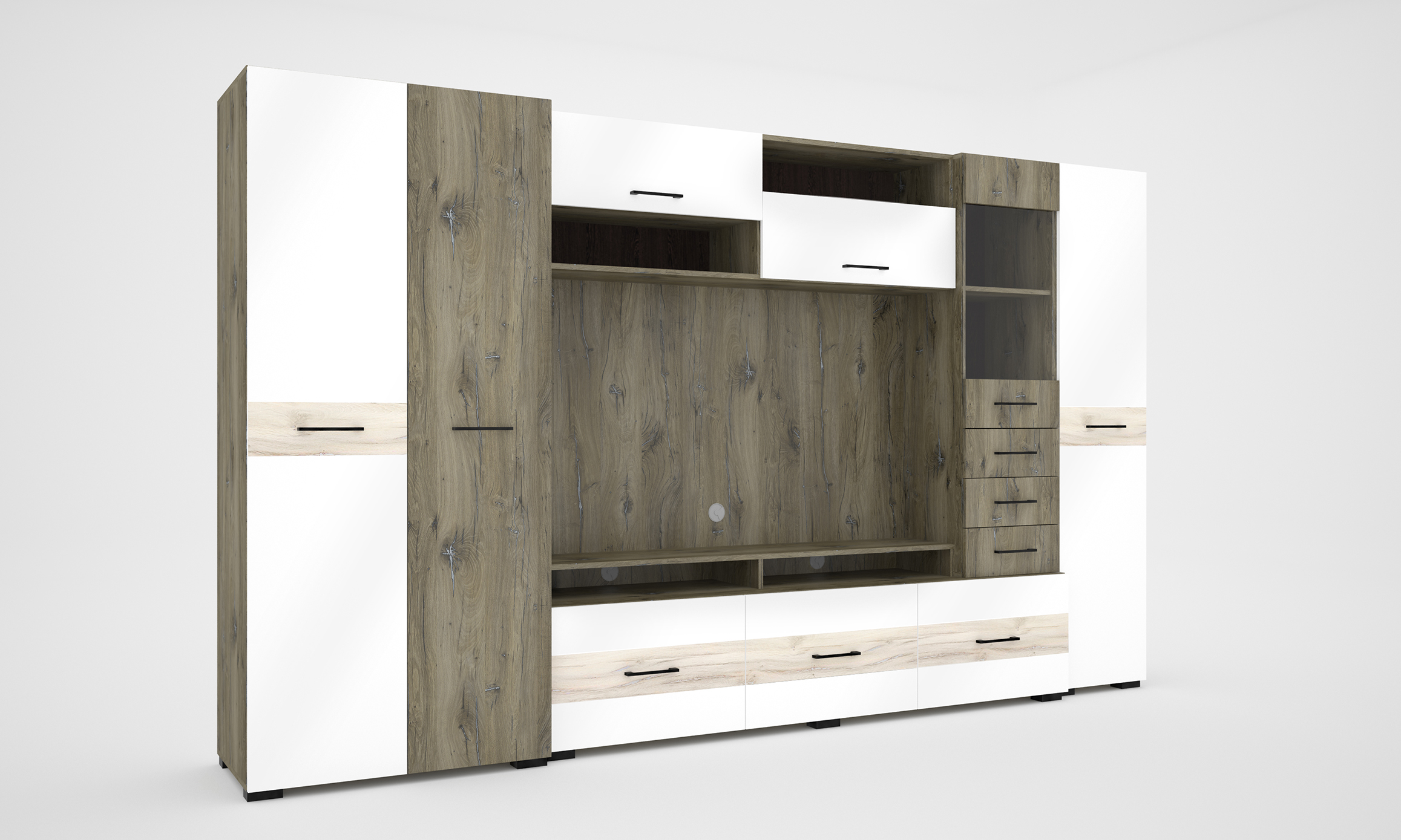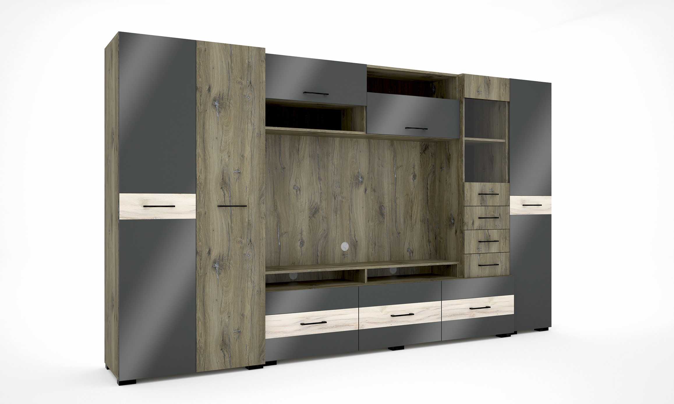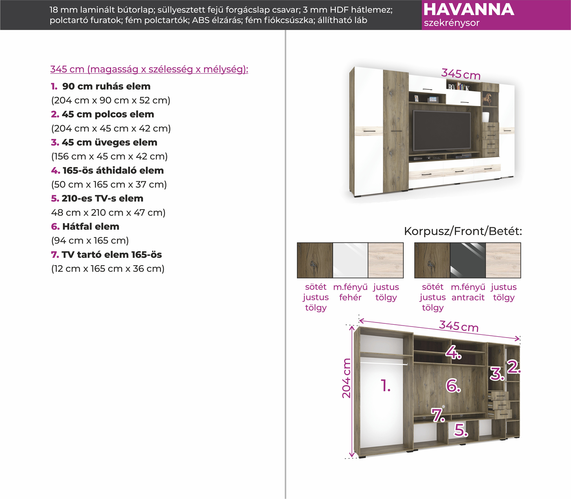 Karakteres, 345 cm-es méretben kapható Havanna szekrénysorunk 3-as színkombinációja különleges megjelenést kölcsönöz nappalijának. Szekrénysorunk sötét justus tölgy-magasfényű fehér-justus tölgy valamint sötét justus tölgy-magasfényű antracit-justus tölgy színben érhető el. A kiválóan pakolható részek, melyek akár plusz polcokkal is kiegészíthetőek, valamint a TV számára kialakított 165 cm hosszú rész, egyaránt a praktikusságot bizonyítják.