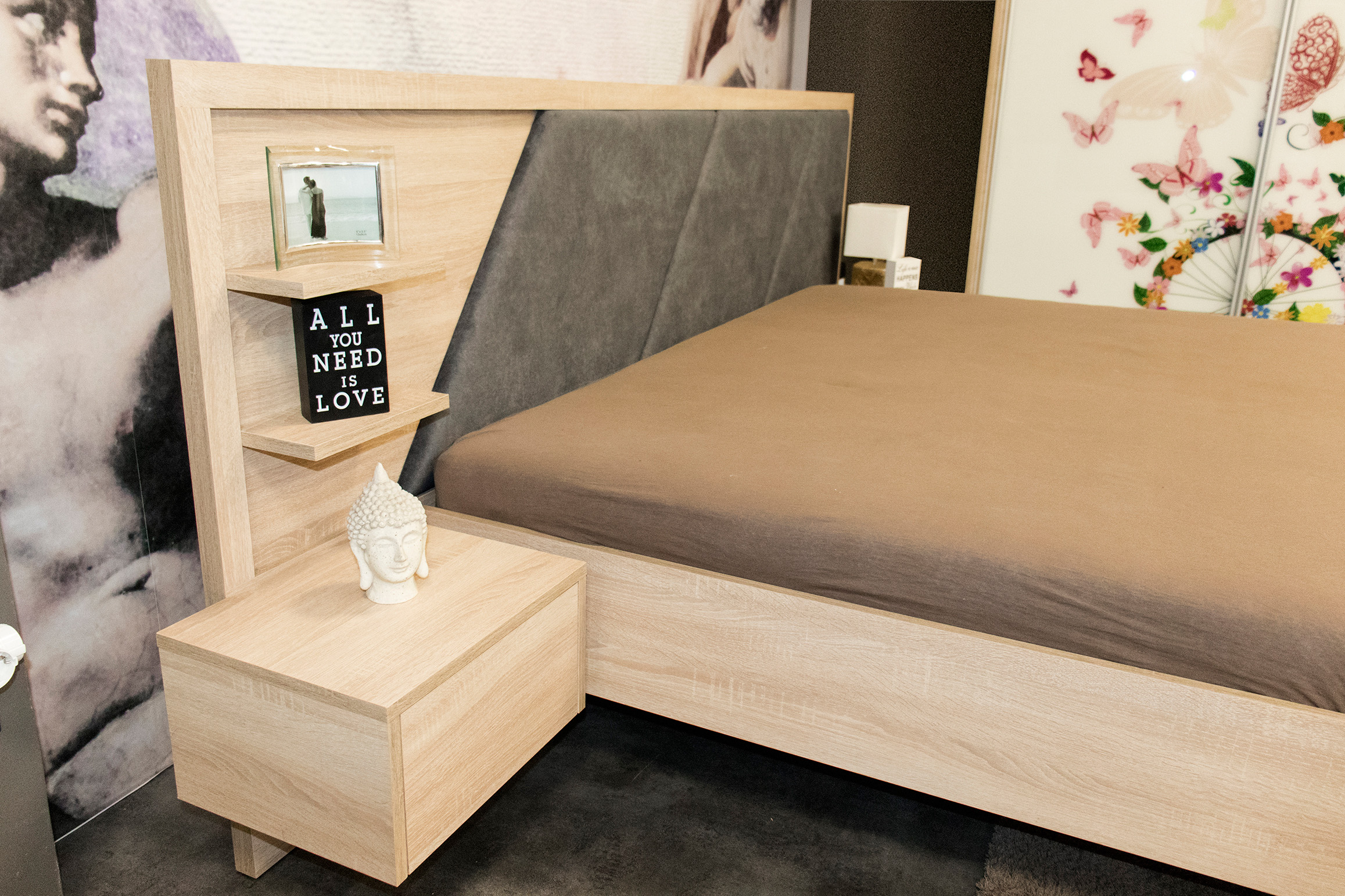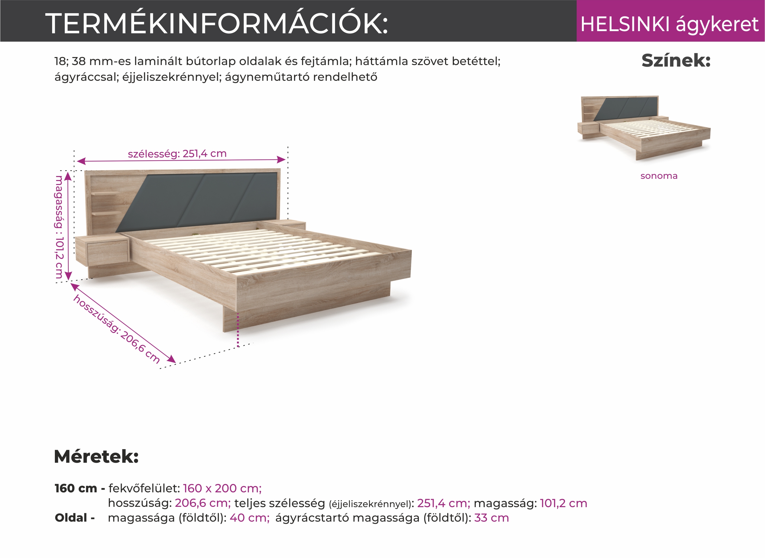 Az ágykeret sonoma színben érhető el. Rendelhető méret: 160 x 200 cm. Ágyneműtartó is vásárolható hozzá.