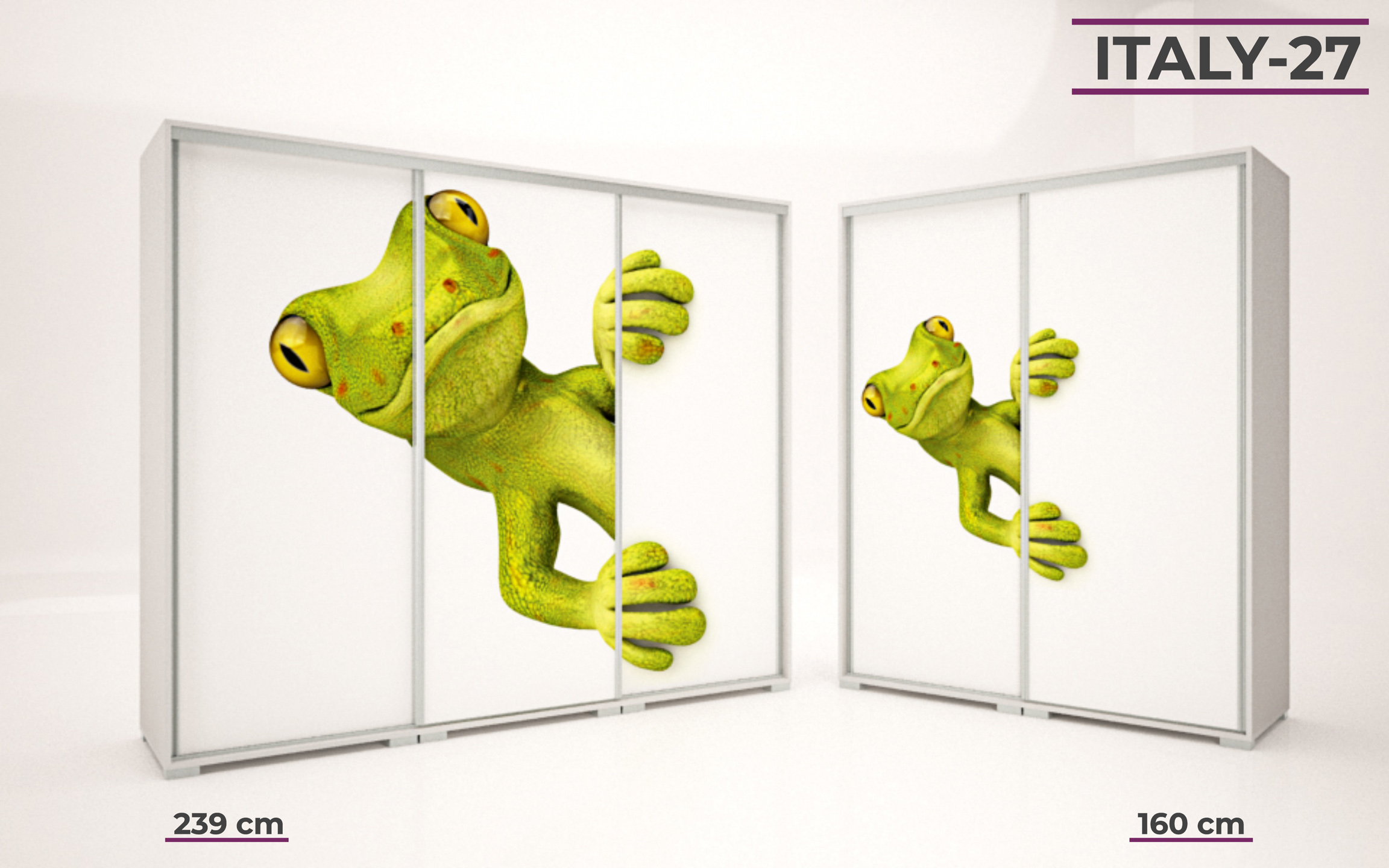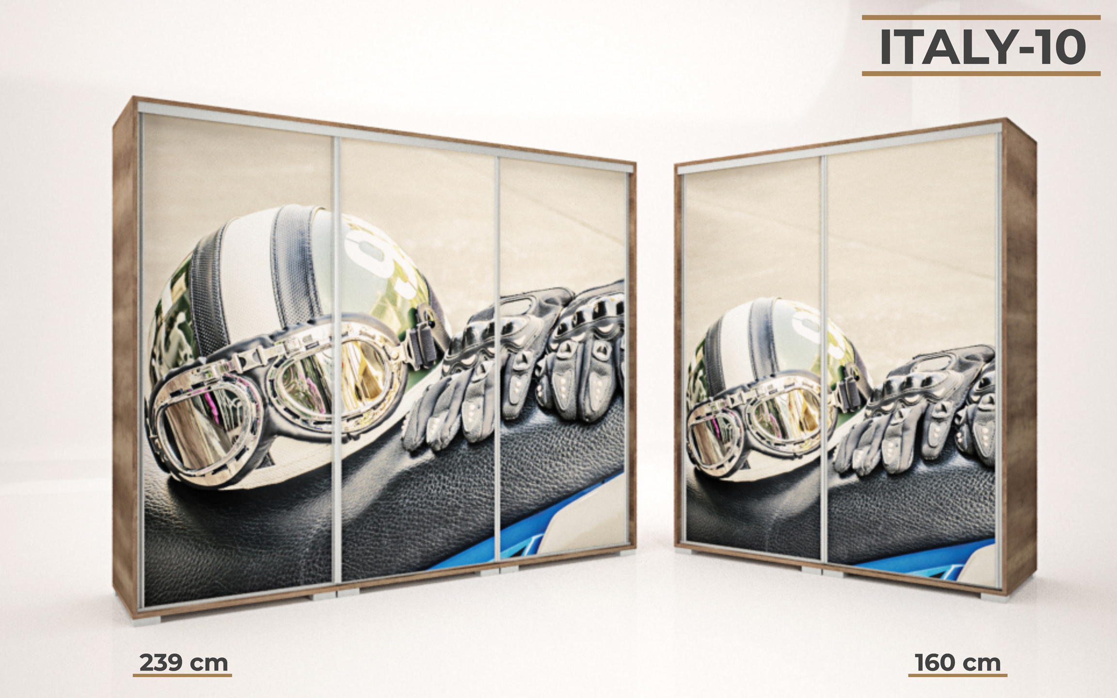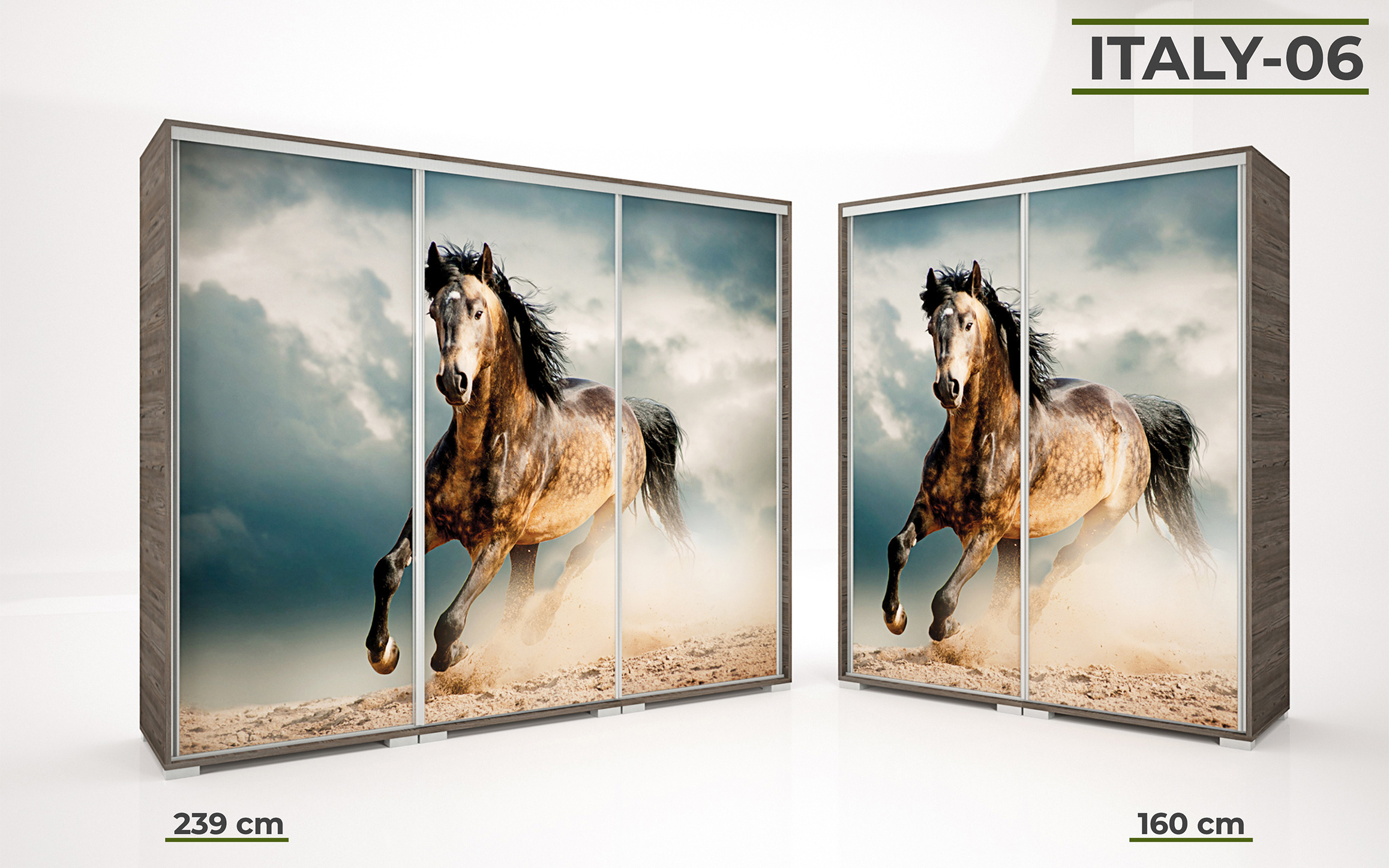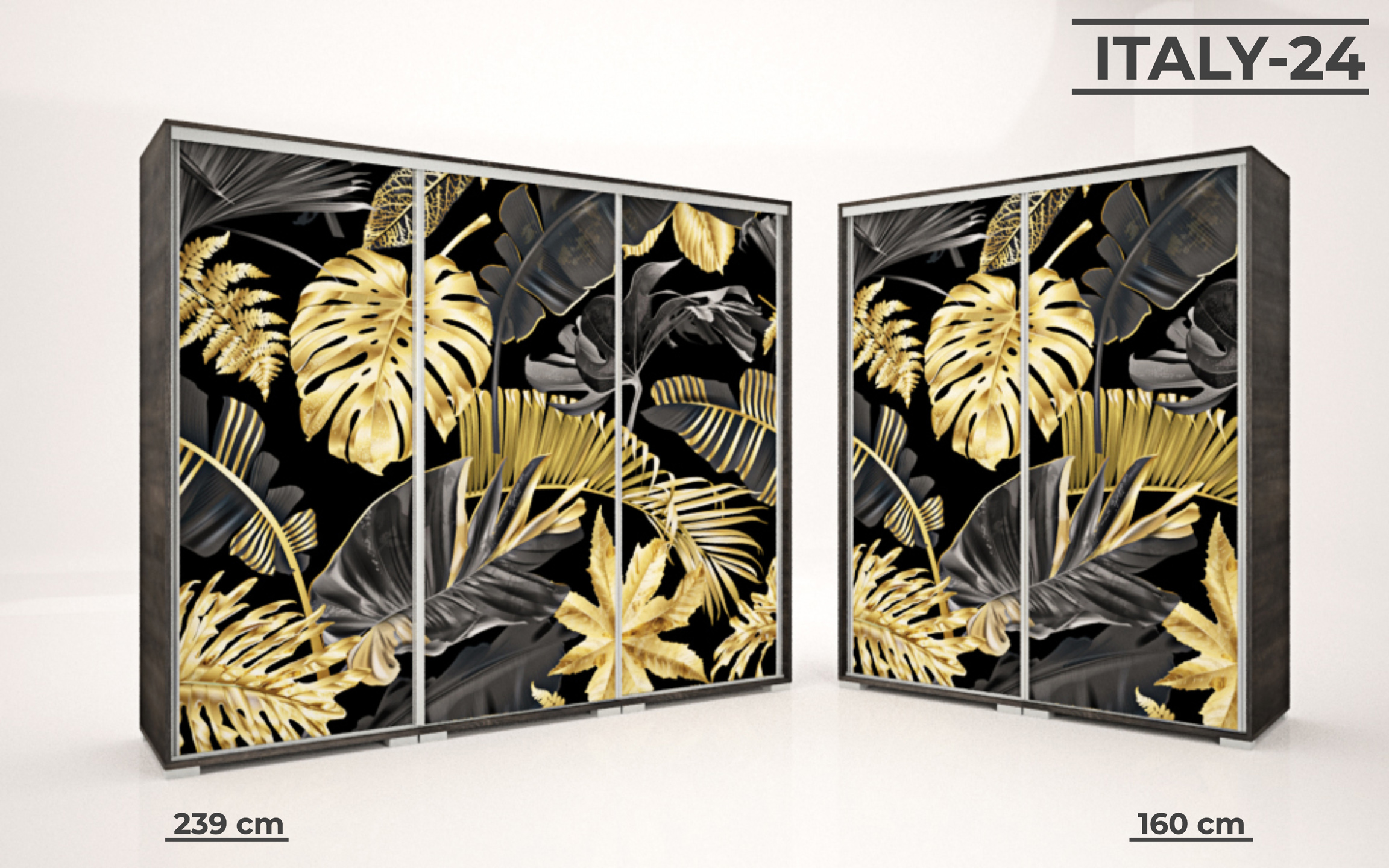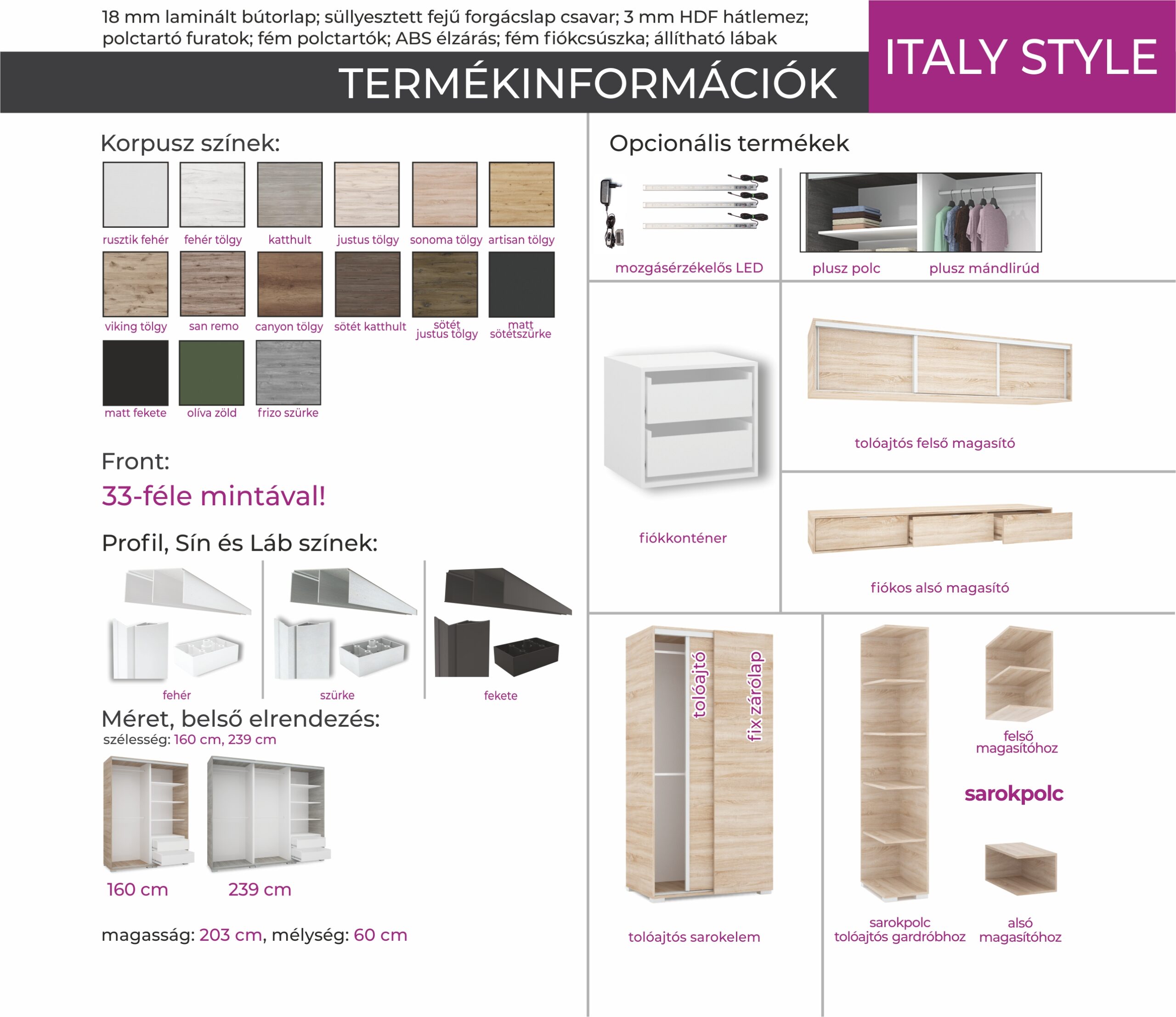 Italy gardrób 160 és 239 cm-es méretben kapható. 16 féle korpusz szín közül választhatunk. A festett mintás ajtó nagyon ízléses megjelenést ad a terméknek. 33 féle minta közül lehet válogatni, szinte minden korosztály talál magának tetsző képet a felhozatal között. Ez a gardrób nem csak hasznos a hálószobában, de egyben annak díszévé is válik. Opcionálisan választható termékek: – sarokpolc – tolóajtós sarokelem – fiókos alsó magasító – tolóajtós felső magasító.