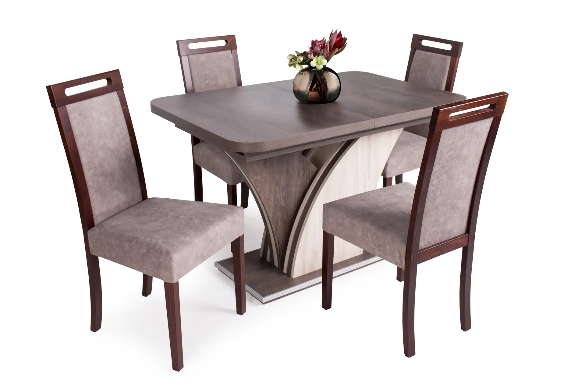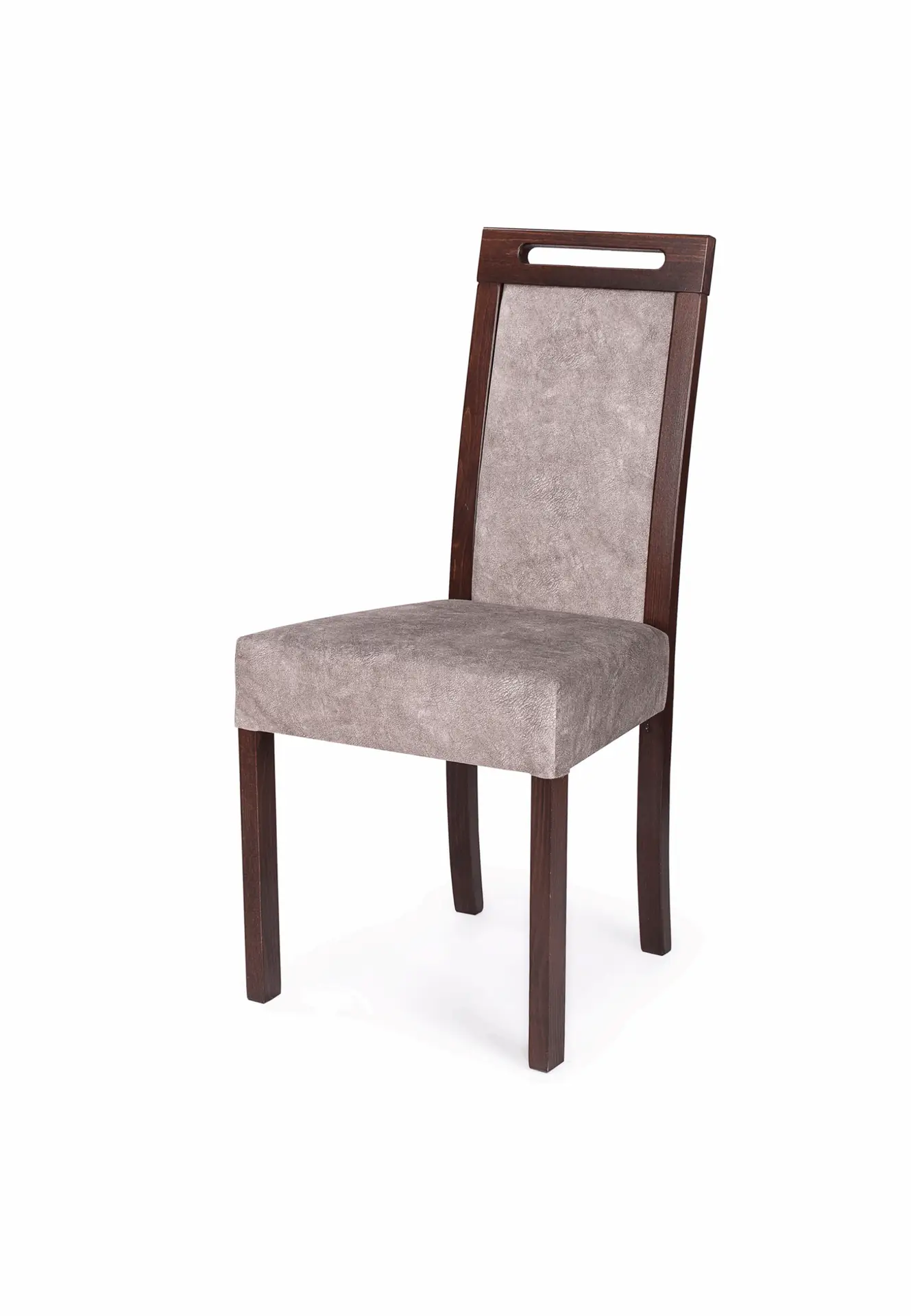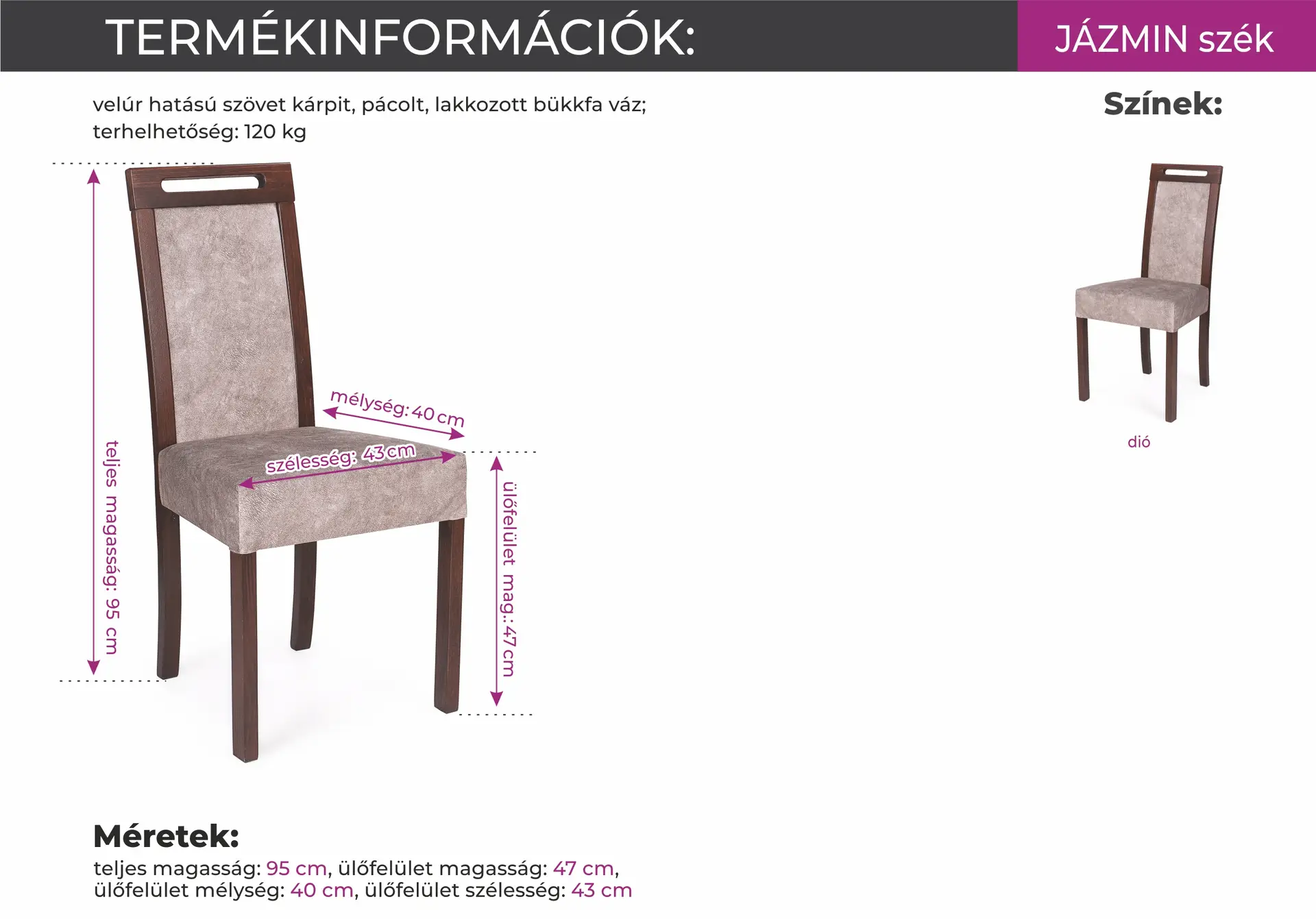 A Jázmin szék pácolt lakkozott bükkfa vázzal és puha velúr hatású kárpittal egy nagyon különleges szék. Ívelt háttámlája és vastagon szivacsozott ülőlapja tökéletes kényelmet biztosít, hosszú használat közben is. Remek választás étkezőkbe, ebédlőkbe.