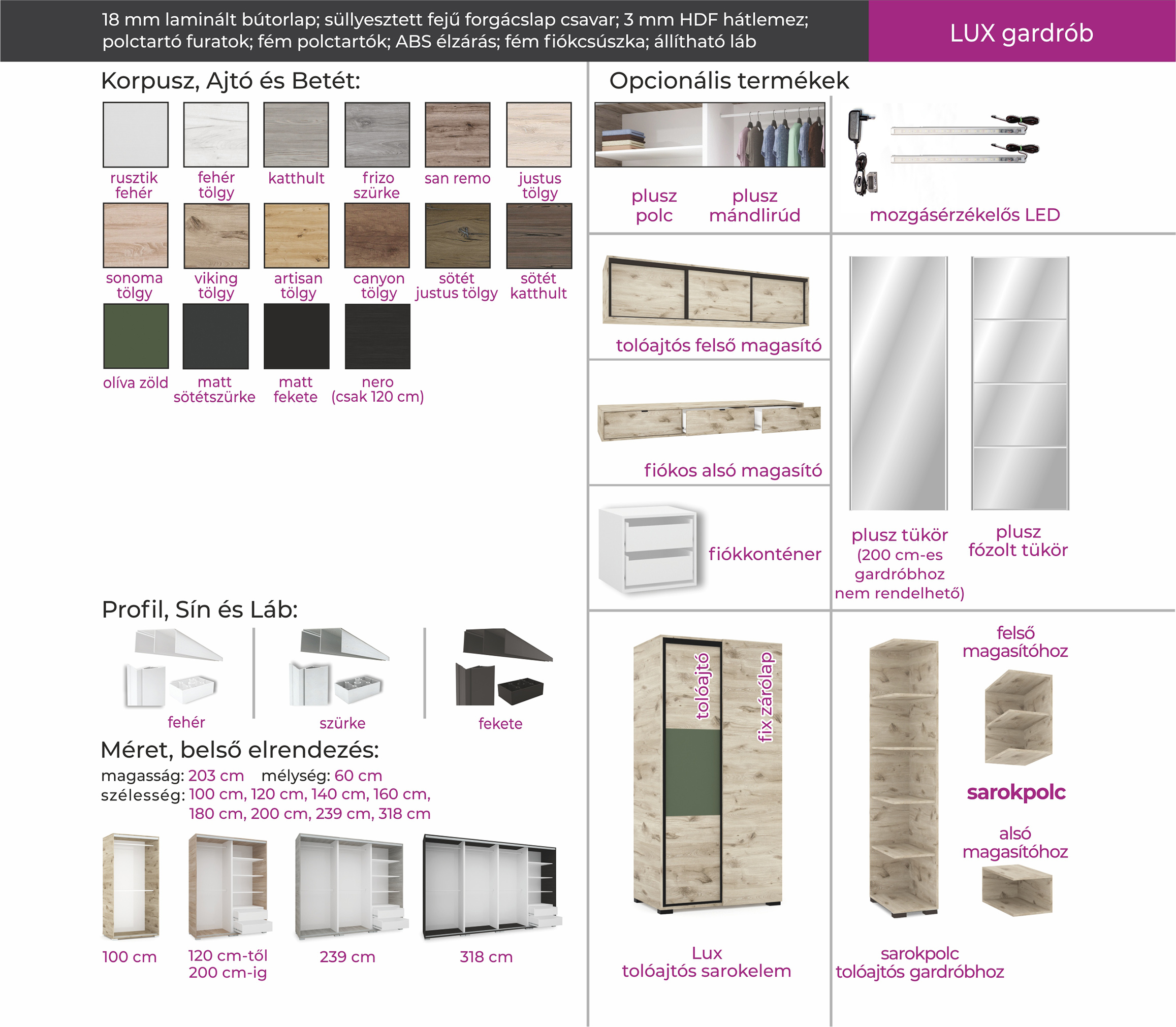 Lux gardróbunk bútorlapos betéttel az Ön hálóját is elegánssá varázsolja. 18 korpusz, 20 ajtó és betét szín közül lehet választani. Akinek kisebb tér áll rendelkezésre, éppúgy megtalálhatja a megfelelő méretűt, mint a tágas hálószobával rendelkezők, hiszen 8 méretben kapható, melyek mindegyikét opcionálisan rendelhető termékeinkkel egészítheti ki. Rendelhető hozzá: – sarokpolc – tolóajtós sarokelem – fózolt tükör – tükör – fiókos alsó magasító – tolóajtós felső magasító.