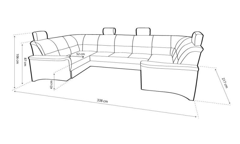külső méret: 338 x 217 x 217 cm, fekvőfelület: 257 x 116 cm, ülőmagasság: 43 cm, beülőmélység: 52 cm, háttámlamagasság: 87 cm, magasság: 106 cm