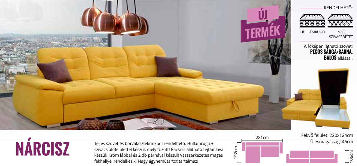 Hullámrugó + szivacs ülőfelülettel készül, mely tűzött! Racsnis állítható fejtámlával készül! Króm lábbal és 2 db párnával készül! Vasszerkezetes magas fekhellyel rendelkezik! Nagy ágyneműtartót tartalmaz! A teljes külső méret: 281*192 cm. Magassága: 106 cm. Az ülő magassága: 46 cm, mélysége: 56 cm. Karfa szélessége: 28 cm, magassága: 58 cm. Fekvő mérete: 124*220 cm.