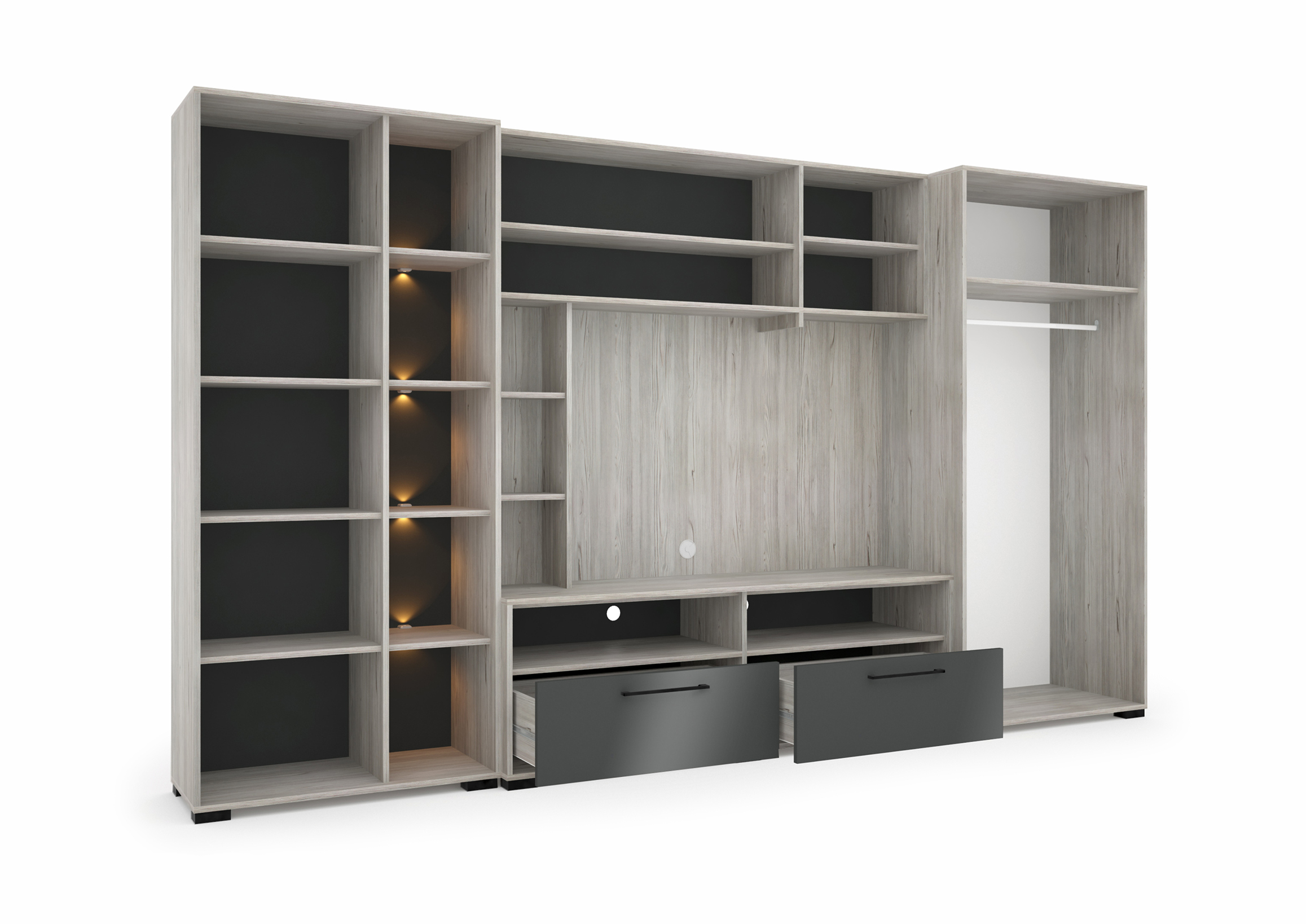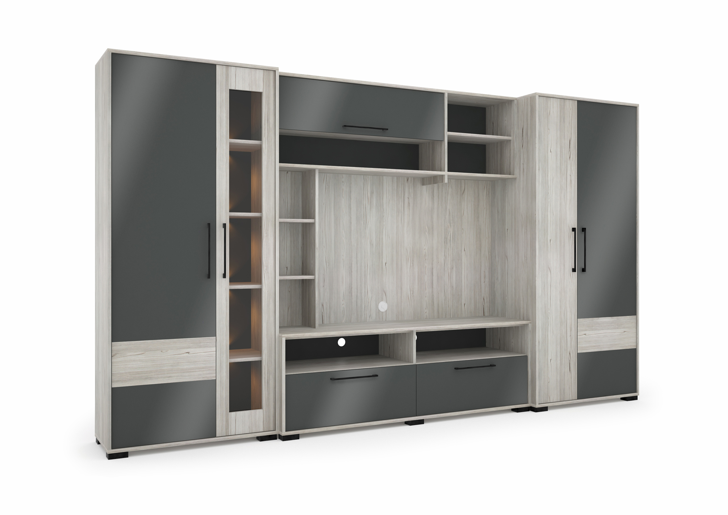 Modern forma és színvilág. Nova szekrénysorunk katthult-magasfényű antracit, illetve katthult-magasfényű fehér színkombinációban kapható. Üveges elemébe opcionálisan LED világítás is rendelhető. Polcos és akasztós elemei további polcokkal egészíthetőek ki.