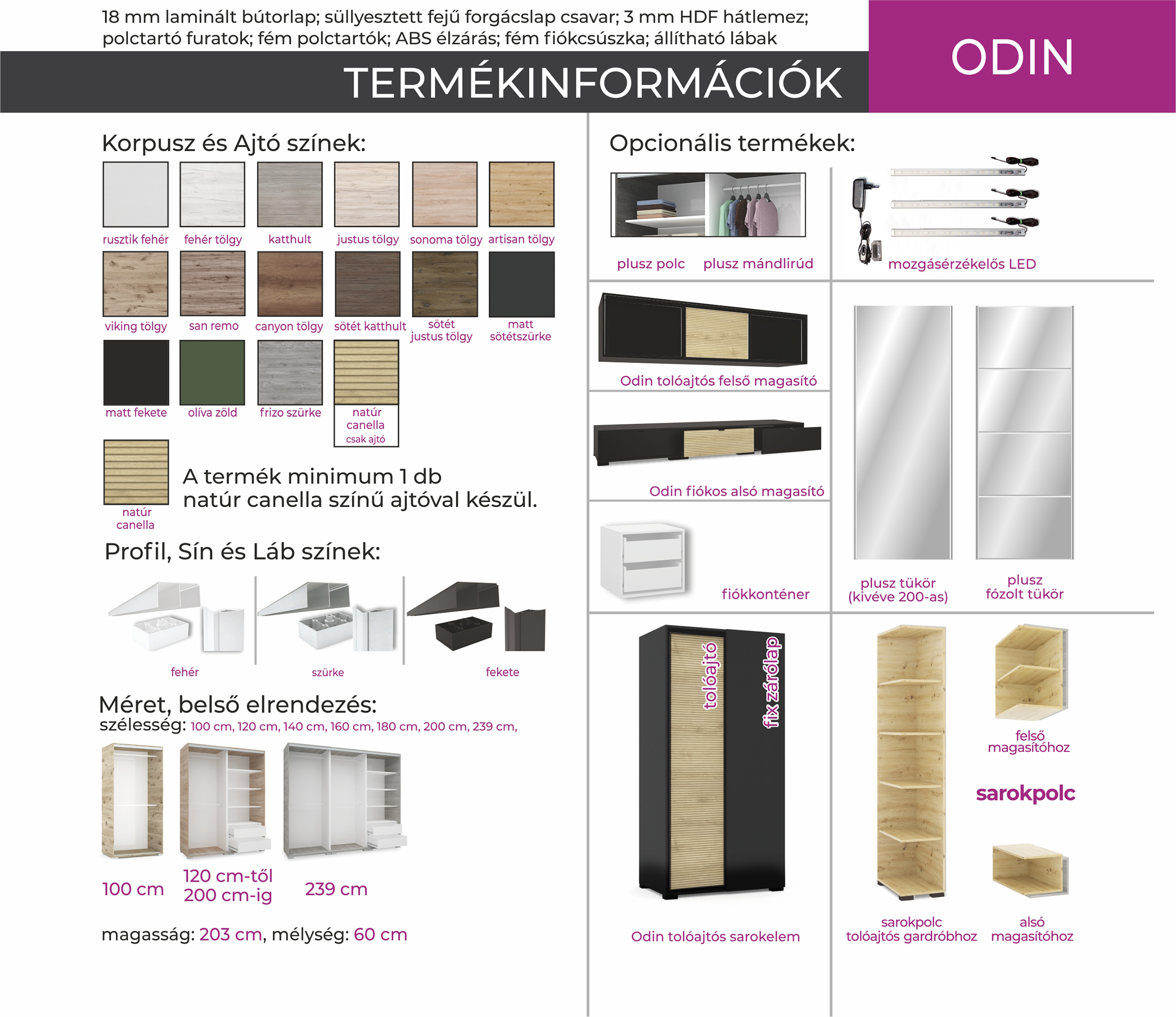 Odin gardróbunk 2 ajtós kivitelben 6 méretben illetve 3 ajtós kivitelben 239 cm-es méretben érhető el. Különlegessége, hogy a natúr canella ajtószín mellé 16 féle ajtó – és korpusz szín, vagy akár tükör is választható. A kiválasztott színkombináció kérhető fehér, szürke vagy fekete profillal és lábbal. Belső elrendezését tekintve teljesen személyre szabható, köszönhetően az akár egymásra is helyezhető fiókdobozoknak, polcoknak, mándlirudaknak. Opcionálisan választható termékek: – sarokpolc – tolóajtós sarokelem natúr canella ajtóval és választható korpusz színnel – fózolt tükör – tükör – fiókos alsó magasító (a gardrób színeiben) – tolóajtós felső magasító (a gardrób színeiben).
