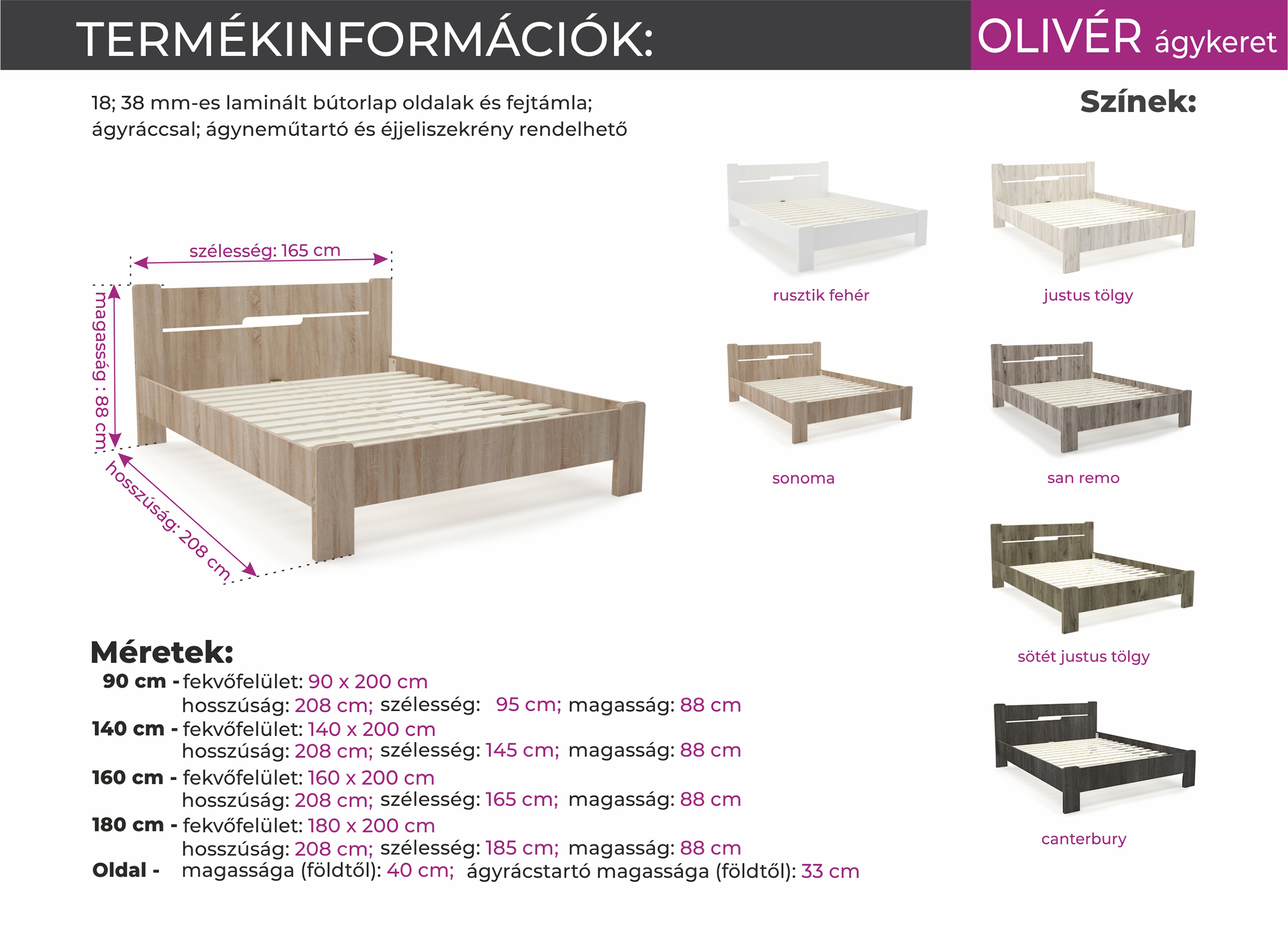 Az ágykeret sonoma, san remo, canterbury és rusztik fehér színben érhető el. Négy méretben rendelhető: 90×200, 140×200, 160×200, 180X200 cm. Ágyneműtartó és éjjeliszekrény is vásárolható hozzá.