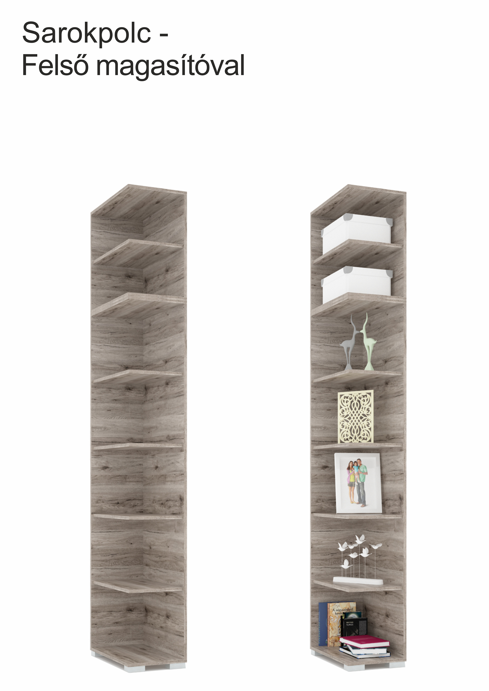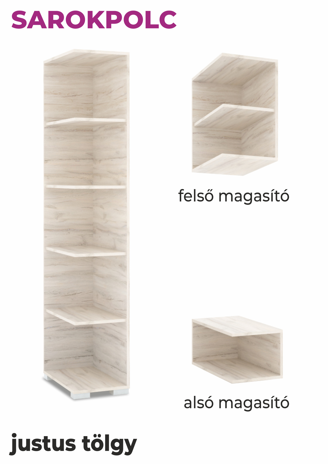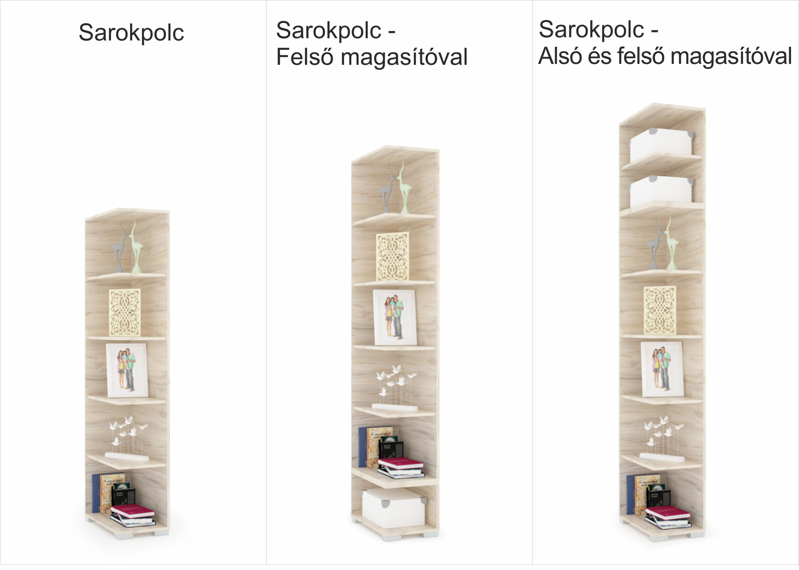 Tolóajtós gardróbjainkhoz, alsó és felső magasítóinkhoz opcionálisan rendelhető sarokpolcaink segítségével hálószobája még otthonosabbá tehető. 14-féle színben érhető el, így könnyedén találhat az Ön gardróbjával harmonizáló darabot.