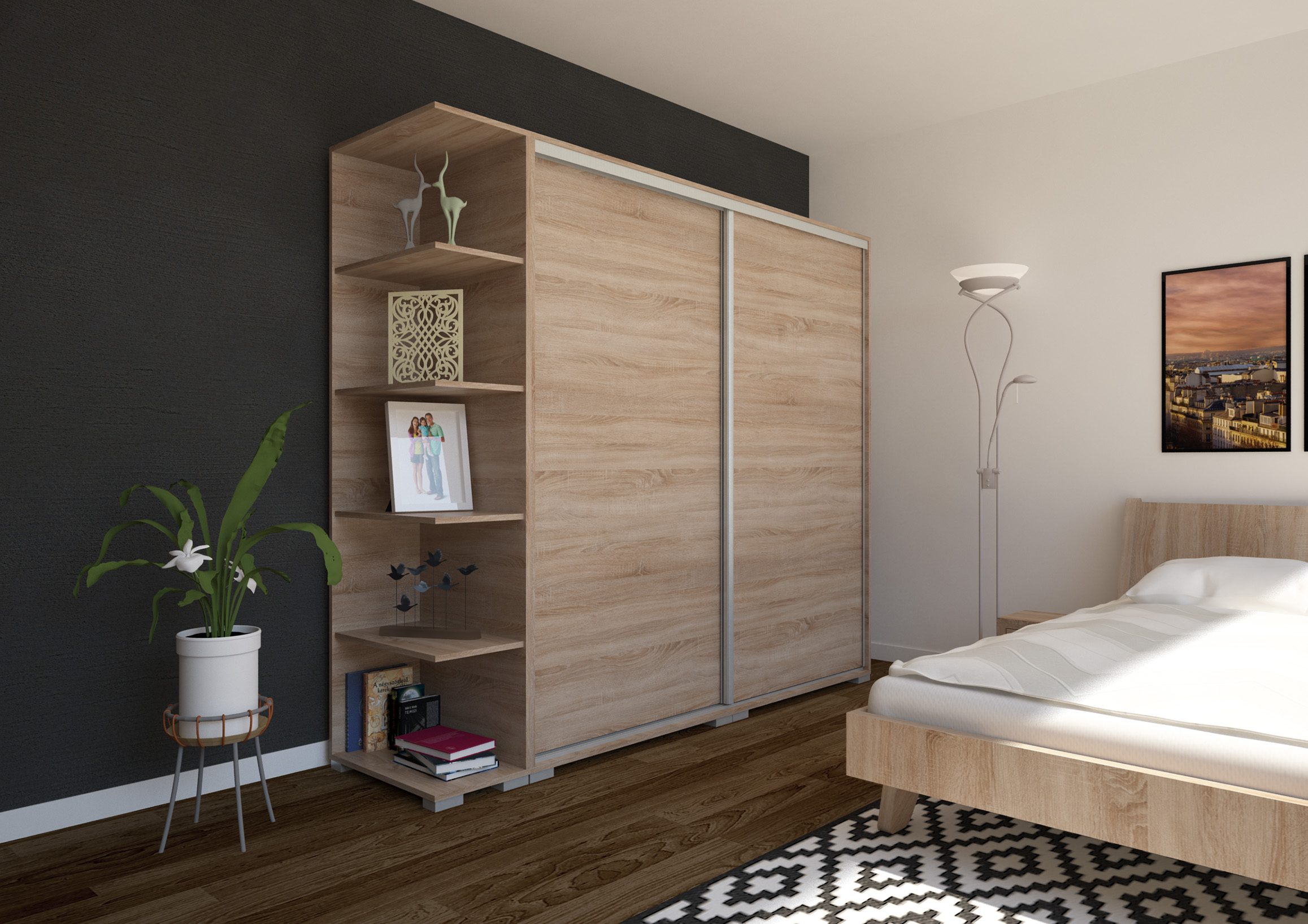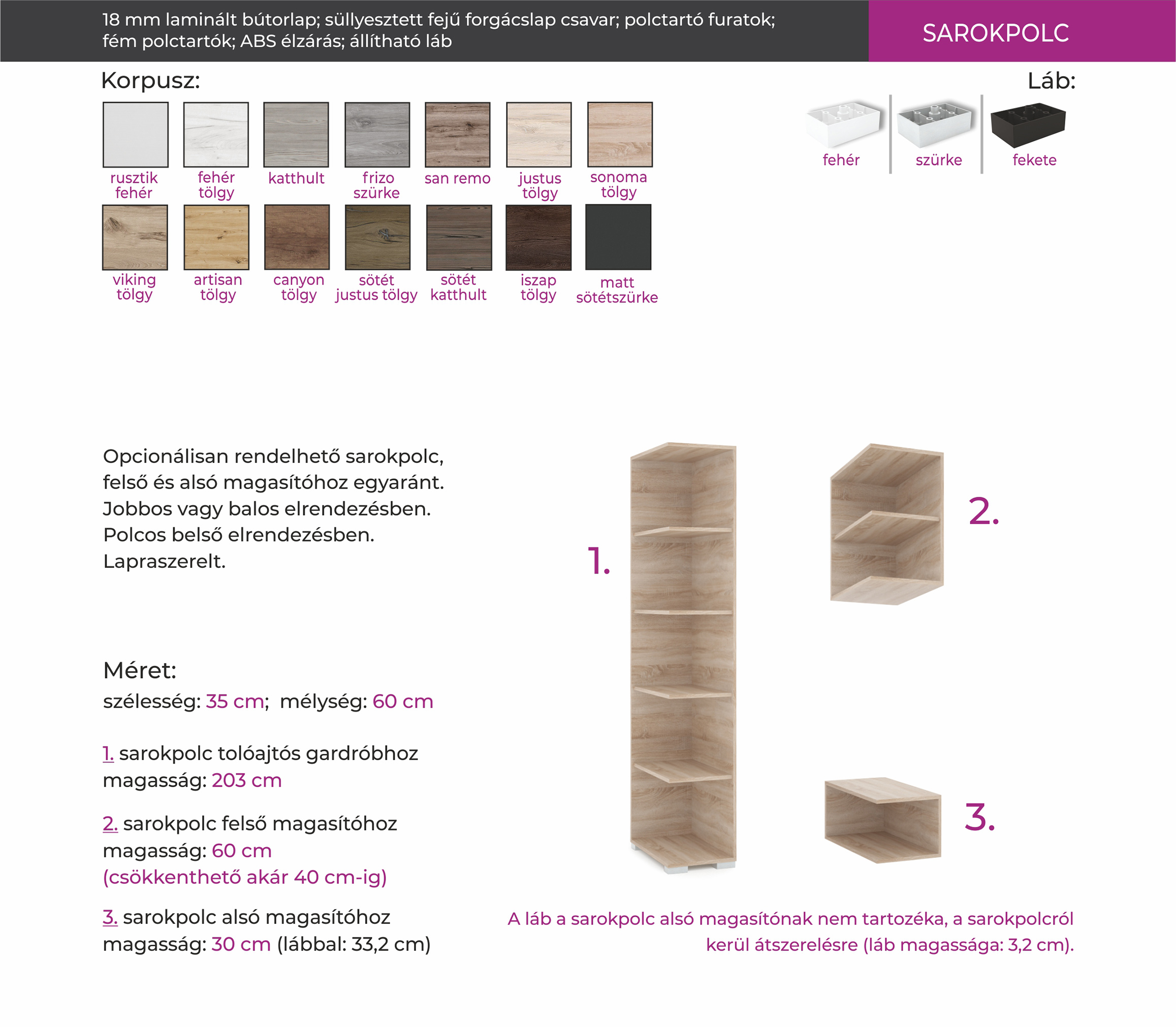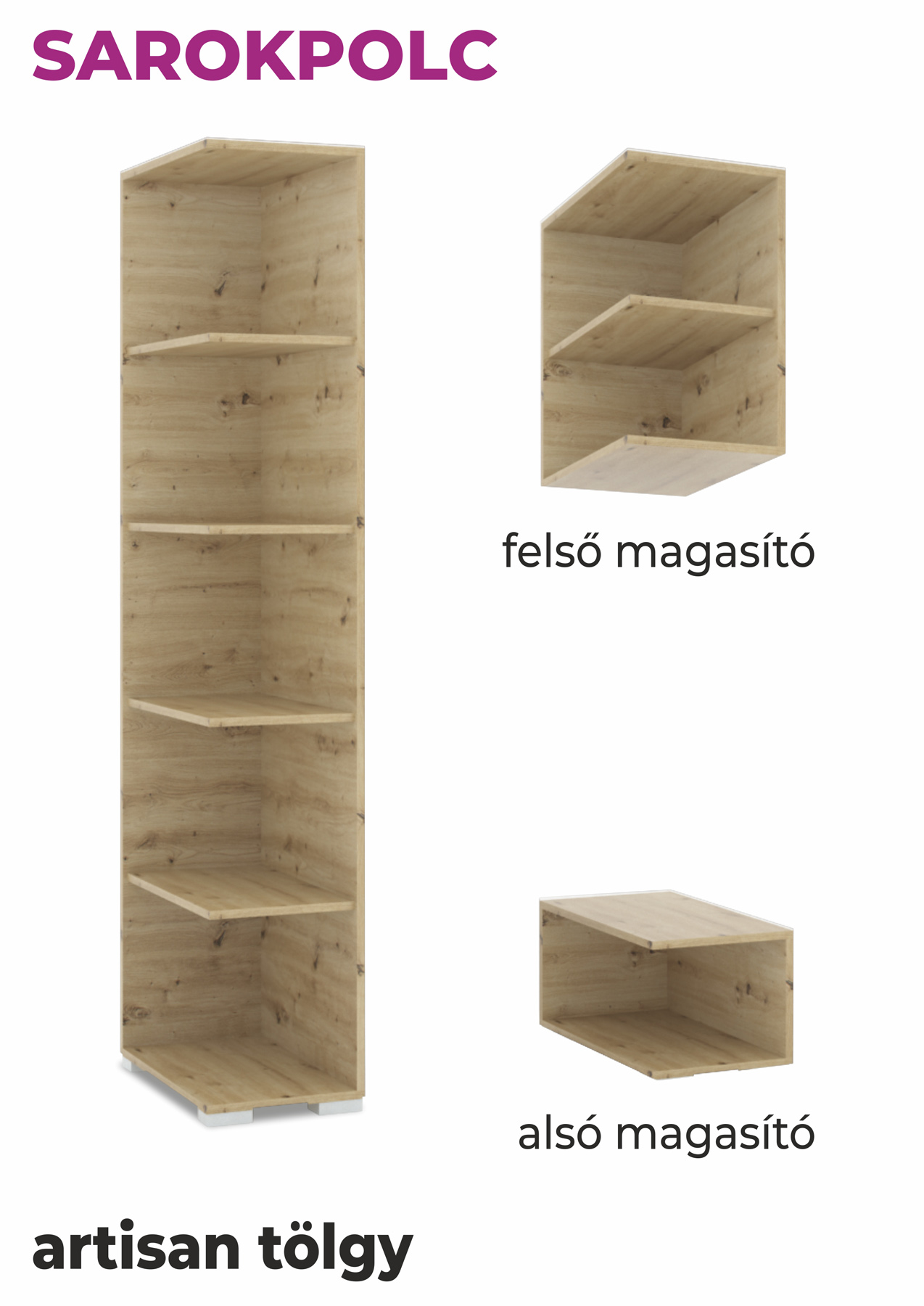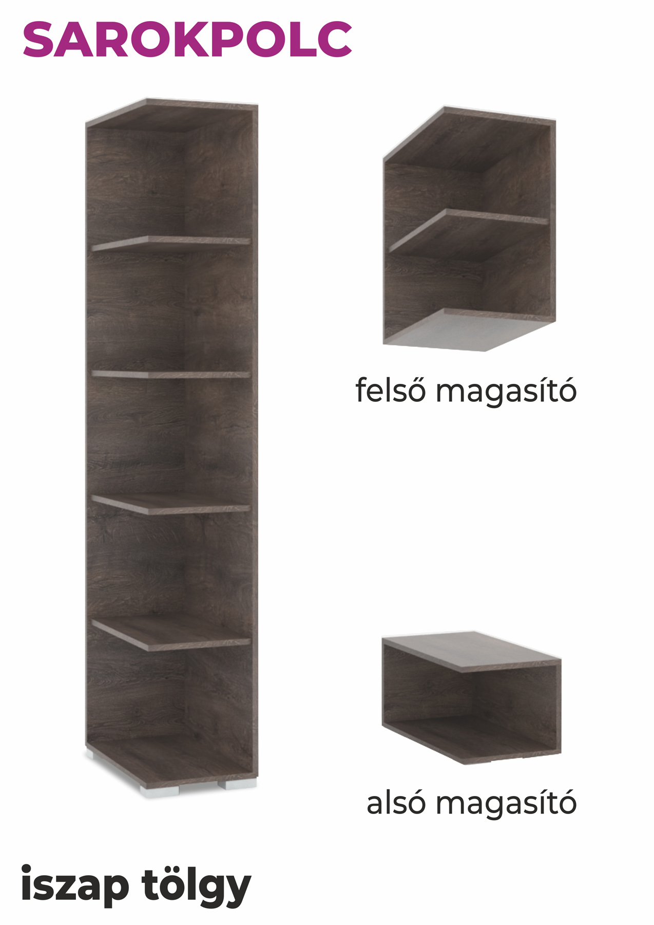 Tolóajtós gardróbjainkhoz, alsó és felső magasítóinkhoz opcionálisan rendelhető sarokpolcaink segítségével hálószobája még otthonosabbá tehető. 14-féle színben érhető el, így könnyedén találhat az Ön gardróbjával harmonizáló darabot.