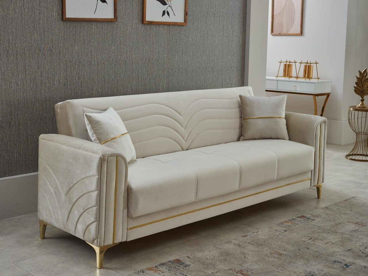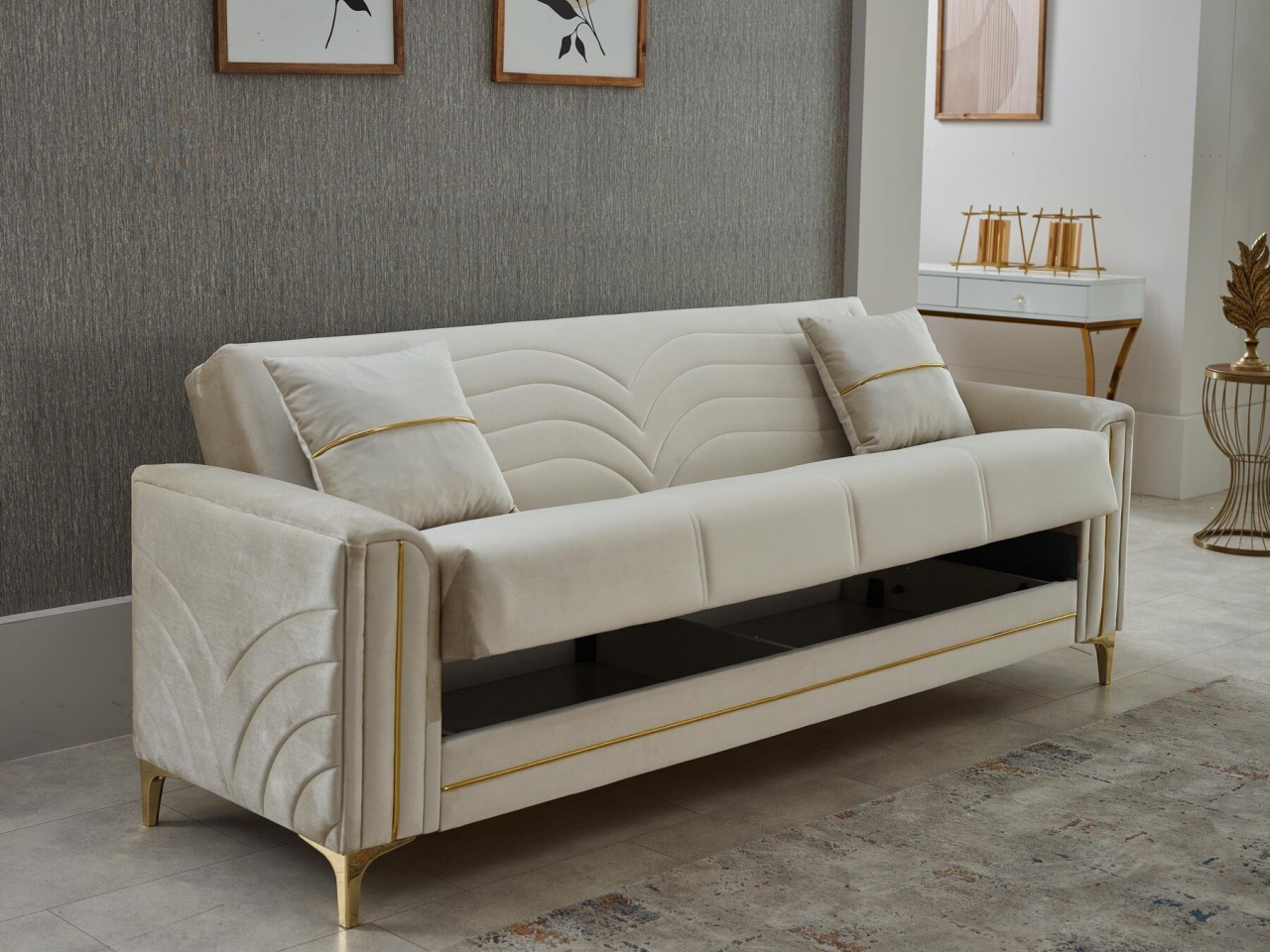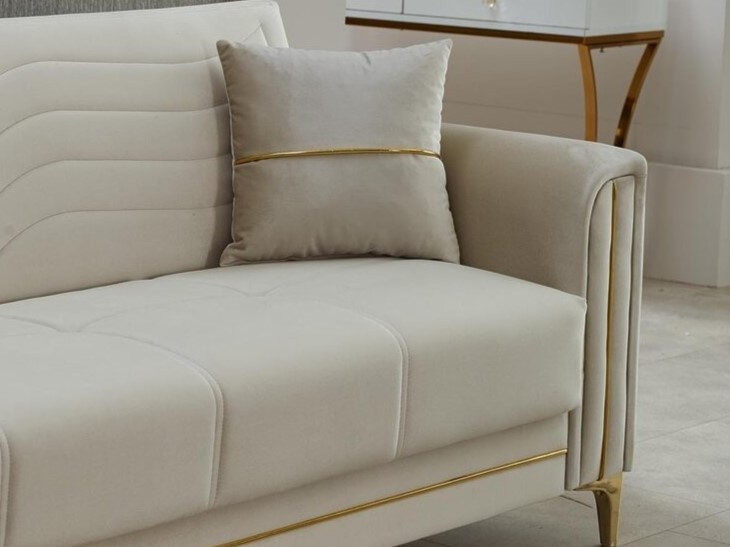 Elegáns és funkcionális megoldás, amely tökéletesen ötvözi a stílust a praktikummal. Ágyazható kialakításának köszönhetően kényelmes pihenőhellyé válik vendégek számára is. A beépített ágyneműtartó gondoskodik róla, hogy a takarók, párnák rendezetten elhelyezhetők legyenek. Bársony szövetével puha, kellemes tapintású felületet kínál, miközben az arany színű díszítés elegáns luxust visz a megjelenésbe. Masszív szerkezete biztos tartást nyújt, párnázata pedig kényelmes ülést ígér. Részletes kidolgozása révén ez a kanapé magára vonzza a figyelmet. Kiváló választás nappaliba, ahol egyszerre legyen vendégfogadásra alkalmas és pihenésre is. Különösen ajánlott olyan otthonokba, ahol a stílus és a rend egyaránt számít.